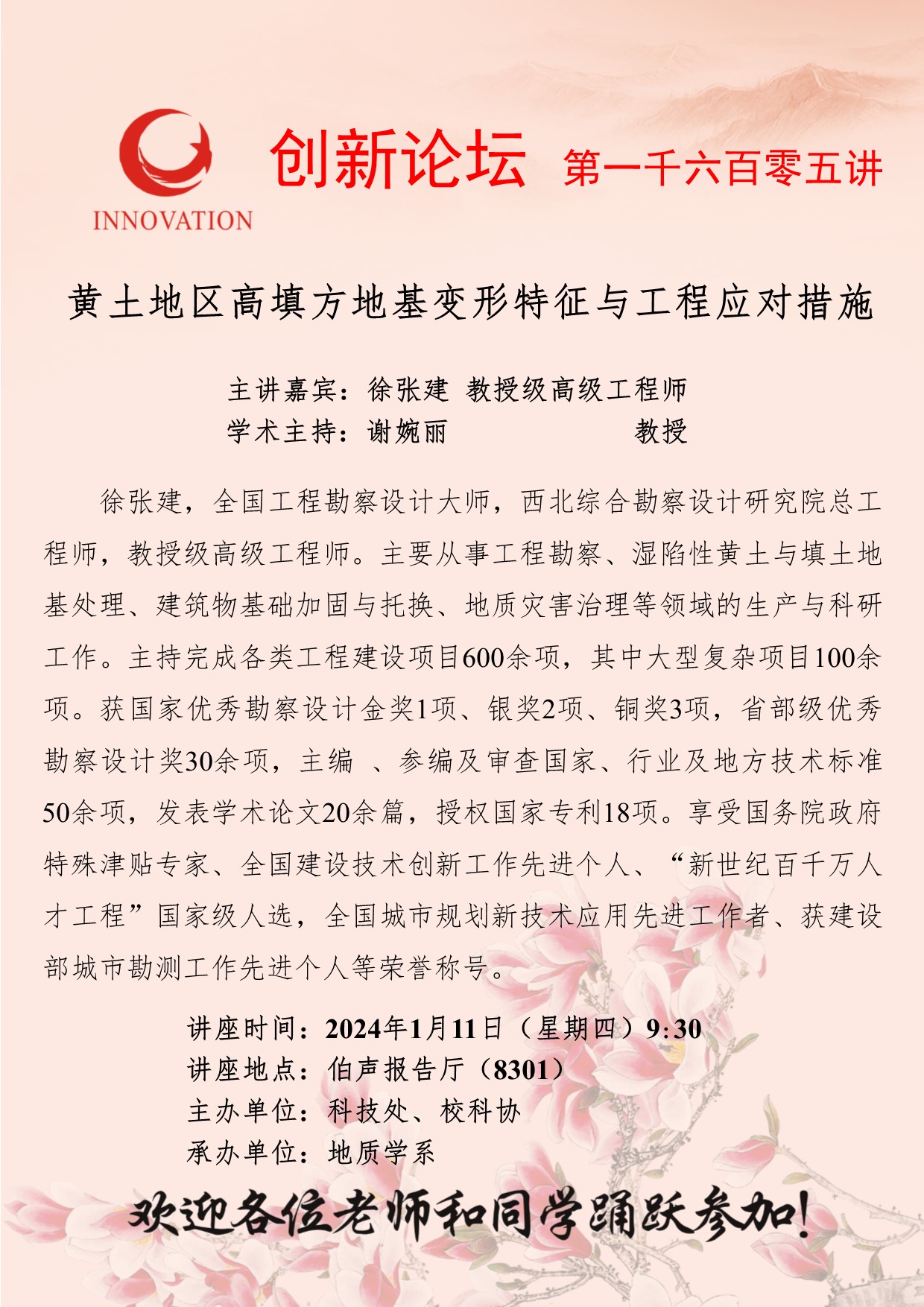 徐张建 教授级高级工程师 欧冠官方网站创新论坛第一千六百零五讲:黄土地区高填方地基变形特征与工程应对措施 讲座时间 2024年1月11日(星期四)9:30 讲座地点 伯声报告厅(8301) 讲座人介绍 徐张建 教授级高级工程师 讲座内容