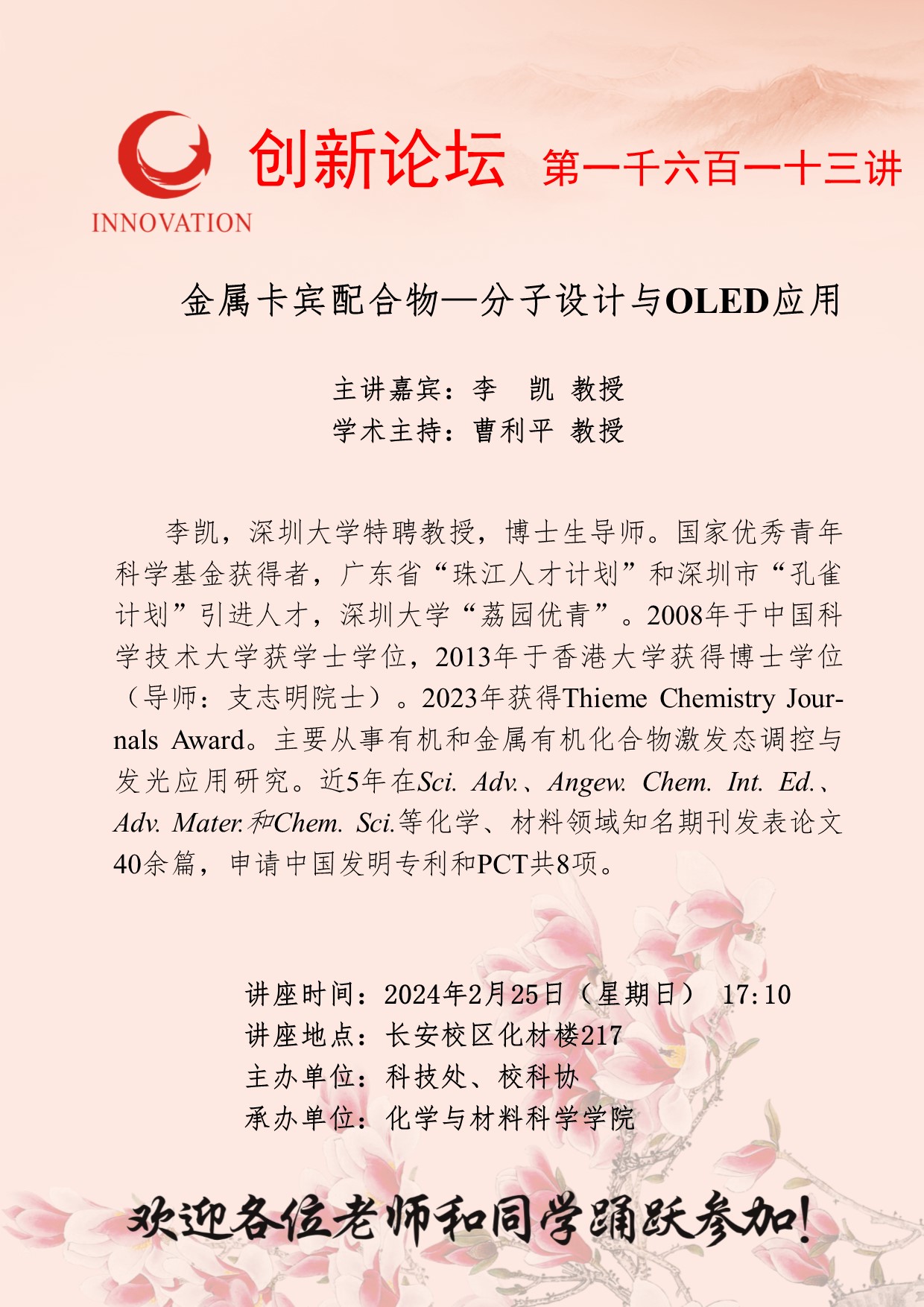 李凯 教授 欧冠官方网站创新论坛第一千六百一十三讲:金属卡宾配合物—分子设计与OLED应用 讲座时间 2024年2月25日(星期日) 17:10 讲座地点 长安校区化材楼217 讲座人介绍 李凯 教授 讲座内容