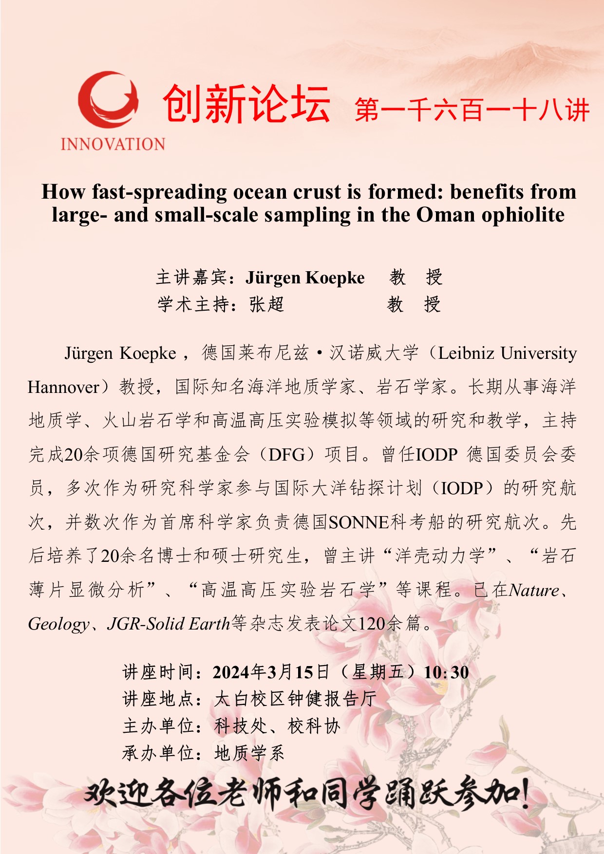 Jürgen Koepke 教 授 欧冠官方网站创新论坛第一千六百一十八讲:How fast-spreading ocean crust is formed: benefits from large- and small-scale sampling in the Oman ophiolite 讲座时间 2024年3月15日(星期五)10:30 讲座地点 太白校区钟健报告厅 讲座人介绍 Jürgen Koepke 教 授 讲座内容