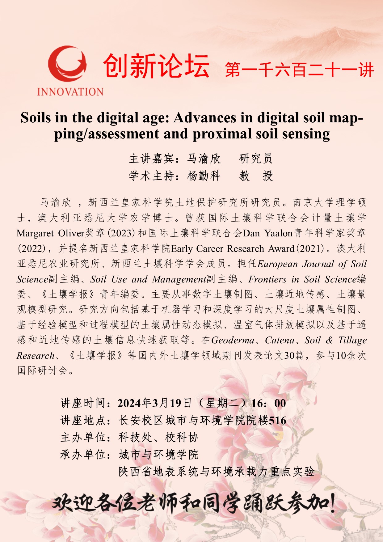 马渝欣 研究员 欧冠官方网站创新论坛第一千六百二十一讲:Soils in the digital age: Advances in digital soil mapping/assessment and proximal soil sensing 讲座时间 2024年3月19日(星期二)16:00 讲座地点 长安校区城市与环境学院院楼516 讲座人介绍 马渝欣 研究员 讲座内容