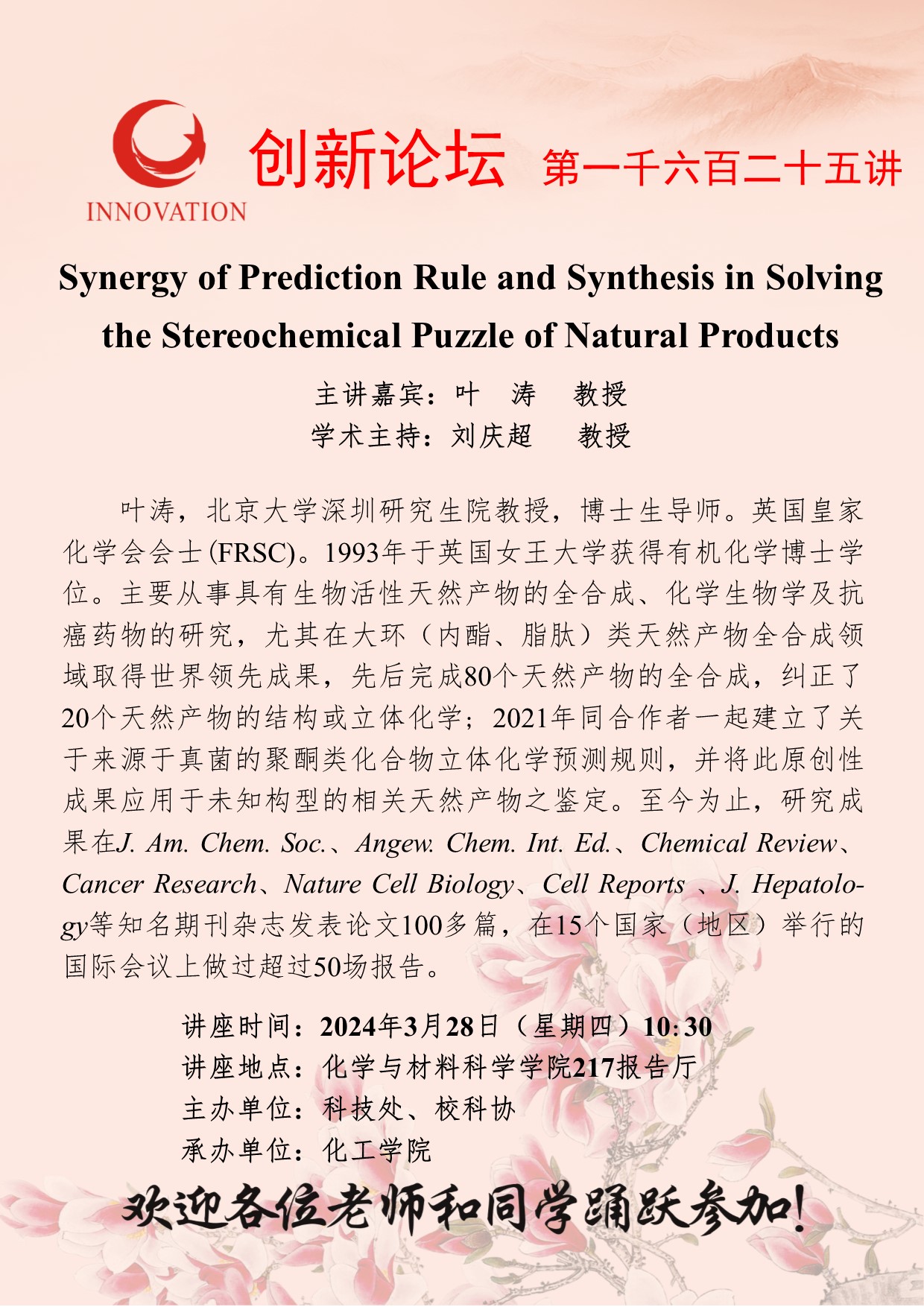 叶涛 教授 欧冠官方网站创新论坛第一千六百二十五讲:Synergy of Prediction Rule and Synthesis in Solving the Stereochemical Puzzle of Natural Products 讲座时间 2024年3月28日(星期四)10:30 讲座地点 化学与材料科学学院217报告厅 讲座人介绍 叶涛 教授 讲座内容