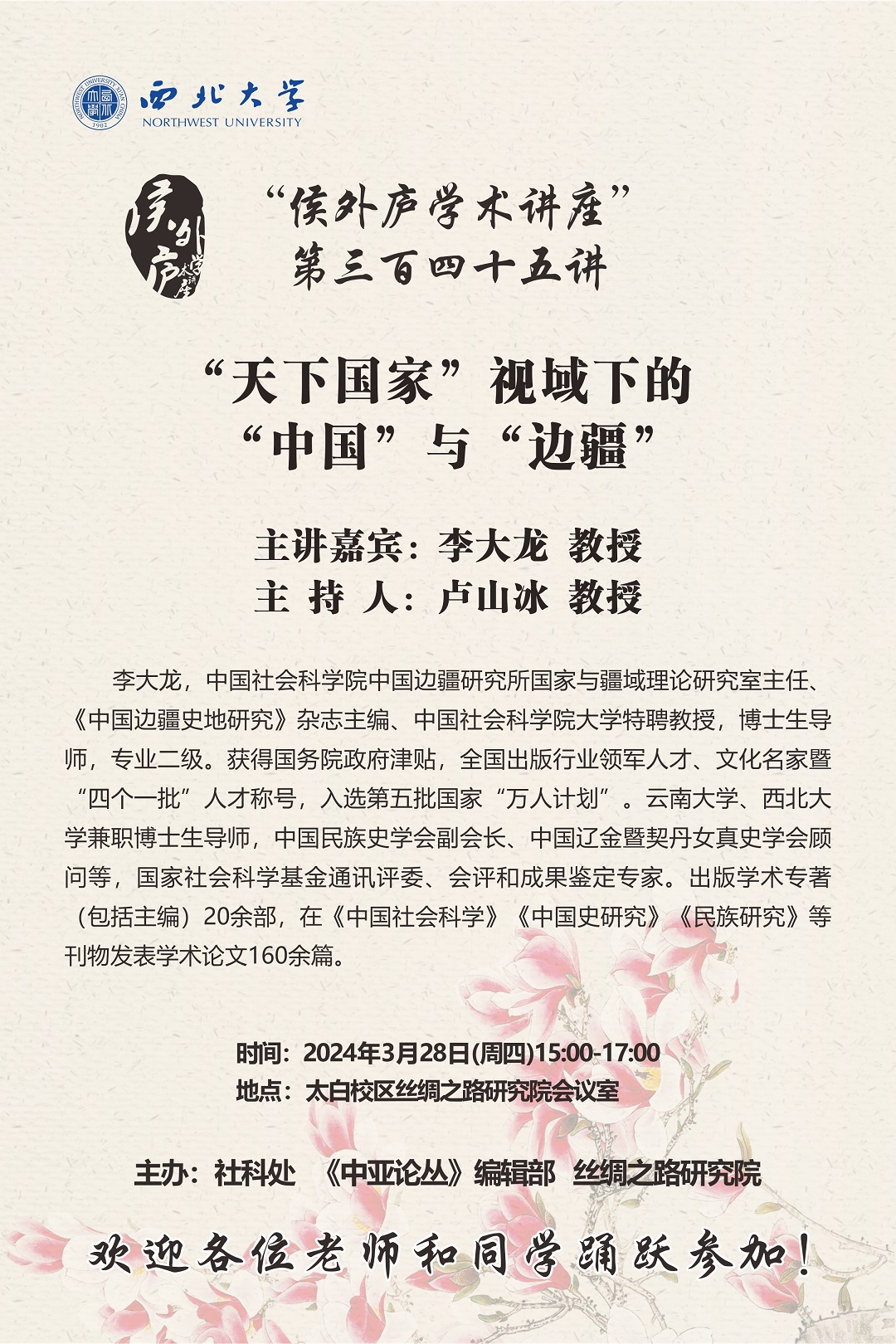 李大龙 教授 侯外庐学术讲座第三百四十五讲:“天下国家”视域下的“中国”与“边疆” 讲座时间 2024年3月28日(周四)15:00-17:00 讲座地点 太白校区丝绸之路研究院会议室 讲座人介绍 李大龙 教授 讲座内容
