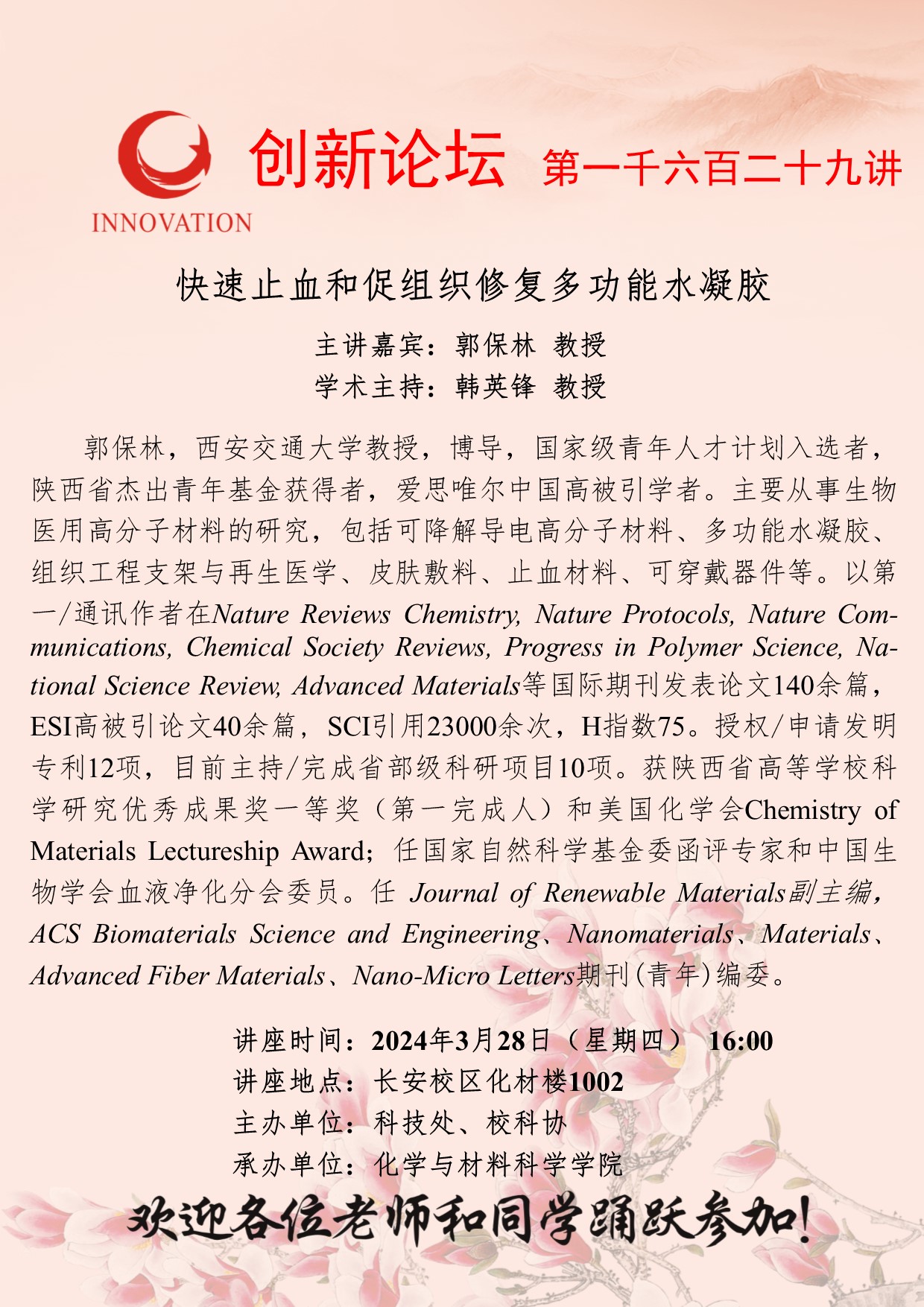 郭保林 教授 欧冠官方网站创新论坛第一千六百二十九讲:快速止血和促组织修复多功能水凝胶 讲座时间 2024年3月28日(星期四) 16:00 讲座地点 长安校区化材楼1002 讲座人介绍 郭保林 教授 讲座内容