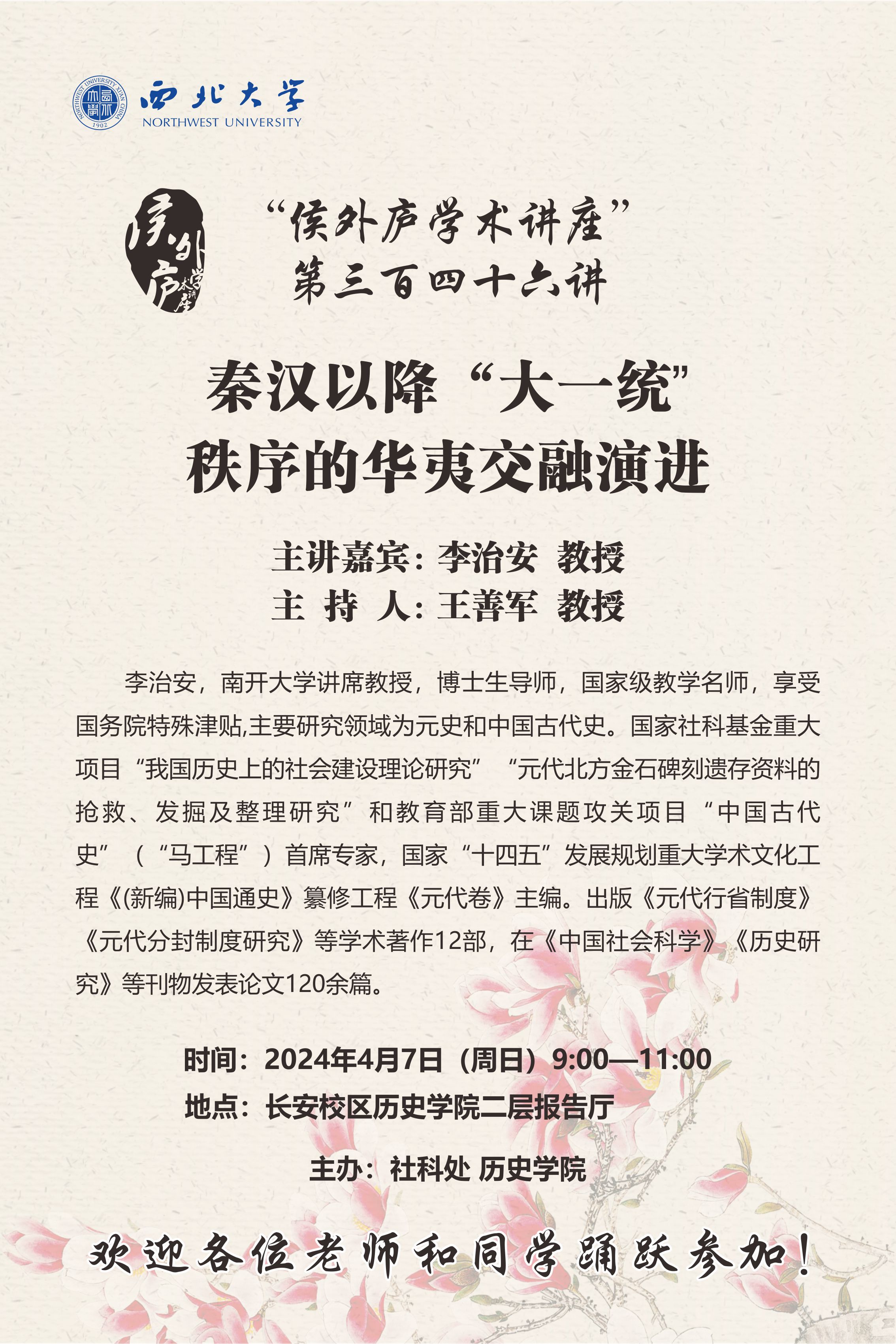 李治安 教授 侯外庐学术讲座第三百四十六讲:秦汉以降“大一统”秩序的华夷交融演进 讲座时间 长安校区历史学院二层报告厅 讲座地点 2024年4月7日(周日)9:00—11:00 讲座人介绍 李治安 教授 讲座内容