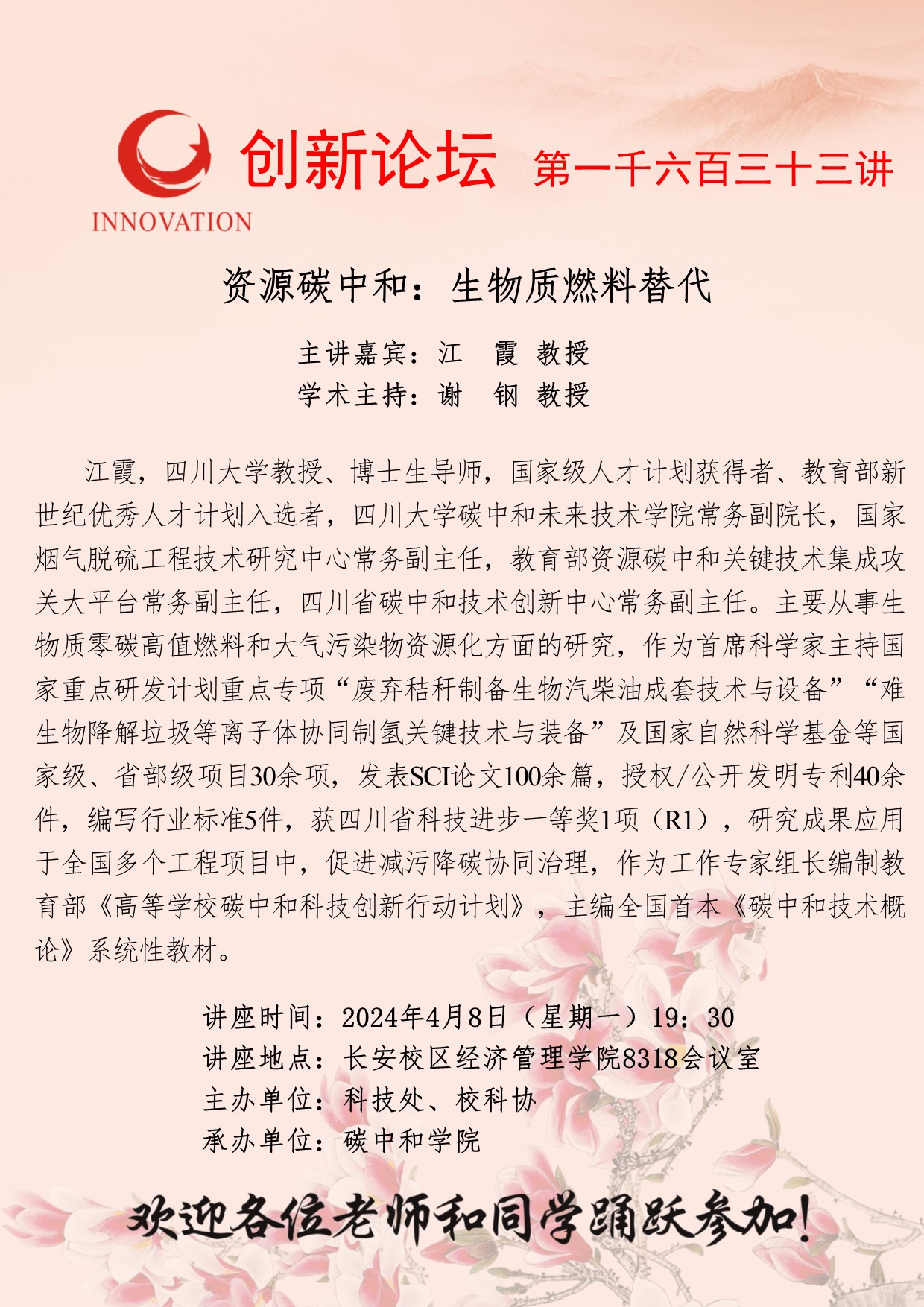 江霞 教授 欧冠官方网站创新论坛第一千六百三十三讲:资源碳中和:生物质燃料替代 讲座时间 2024年4月8日(星期一)19:30 讲座地点 长安校区经济管理学院8318会议室 讲座人介绍 江霞 教授 讲座内容