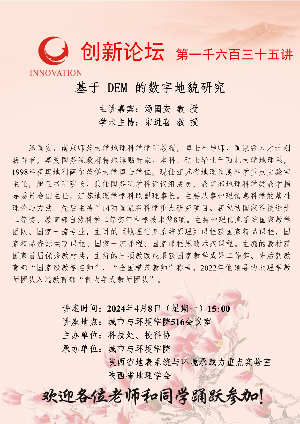 汤国安 教授 欧冠官方网站创新论坛第一千六百三十五讲:基于 DEM 的数字地貌研究 讲座时间 2024年4月8日(星期一)15:00 讲座地点 城市与环境学院516会议室 讲座人介绍 汤国安 教授 讲座内容