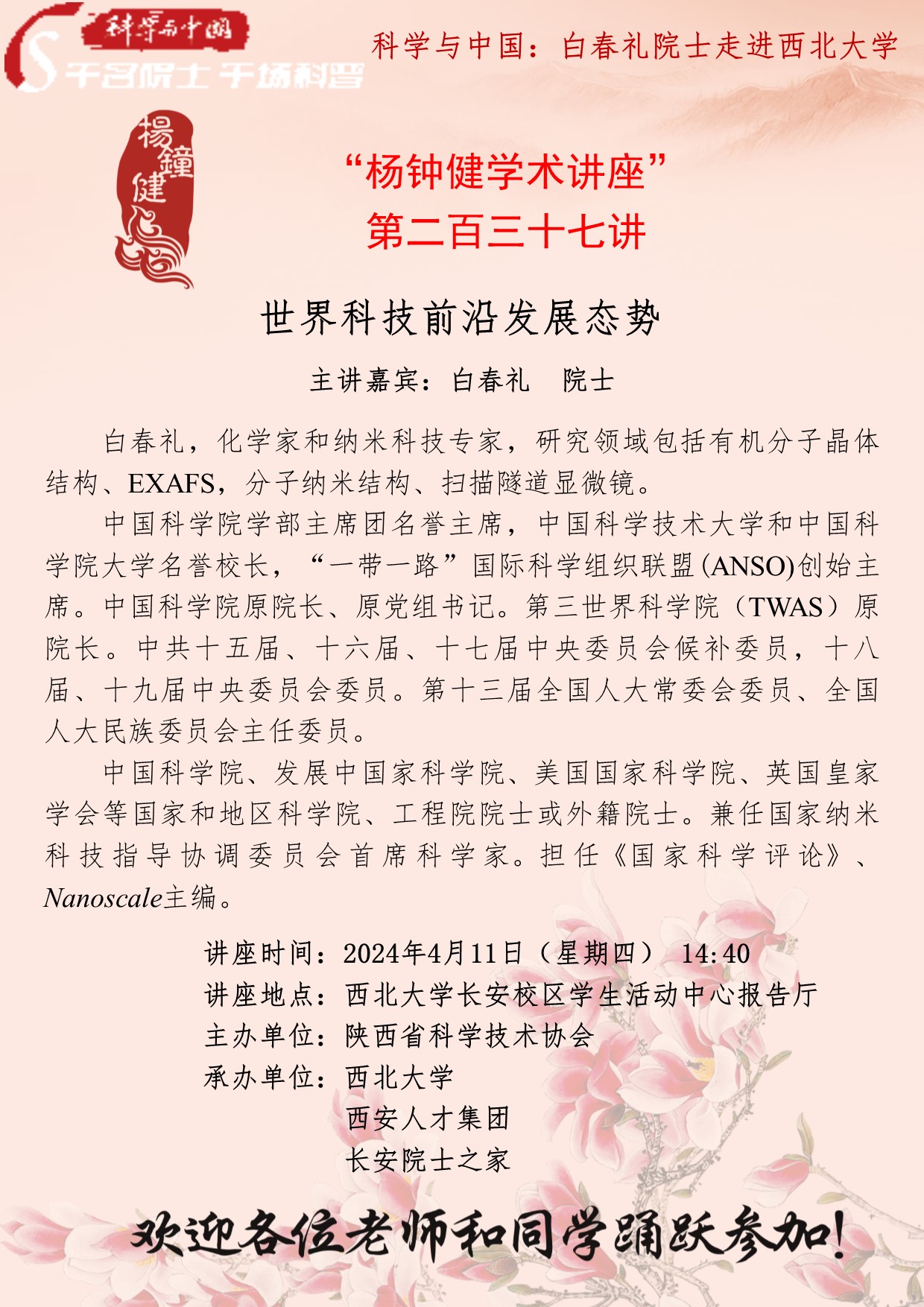 白春礼 院士 “杨钟健学术讲座”第二百三十七讲:世界科技前沿发展态势 讲座时间 2024年4月11日(星期四) 14:40 讲座地点 欧冠官方网站长安校区学生活动中心报告厅 讲座人介绍 白春礼 院士 讲座内容