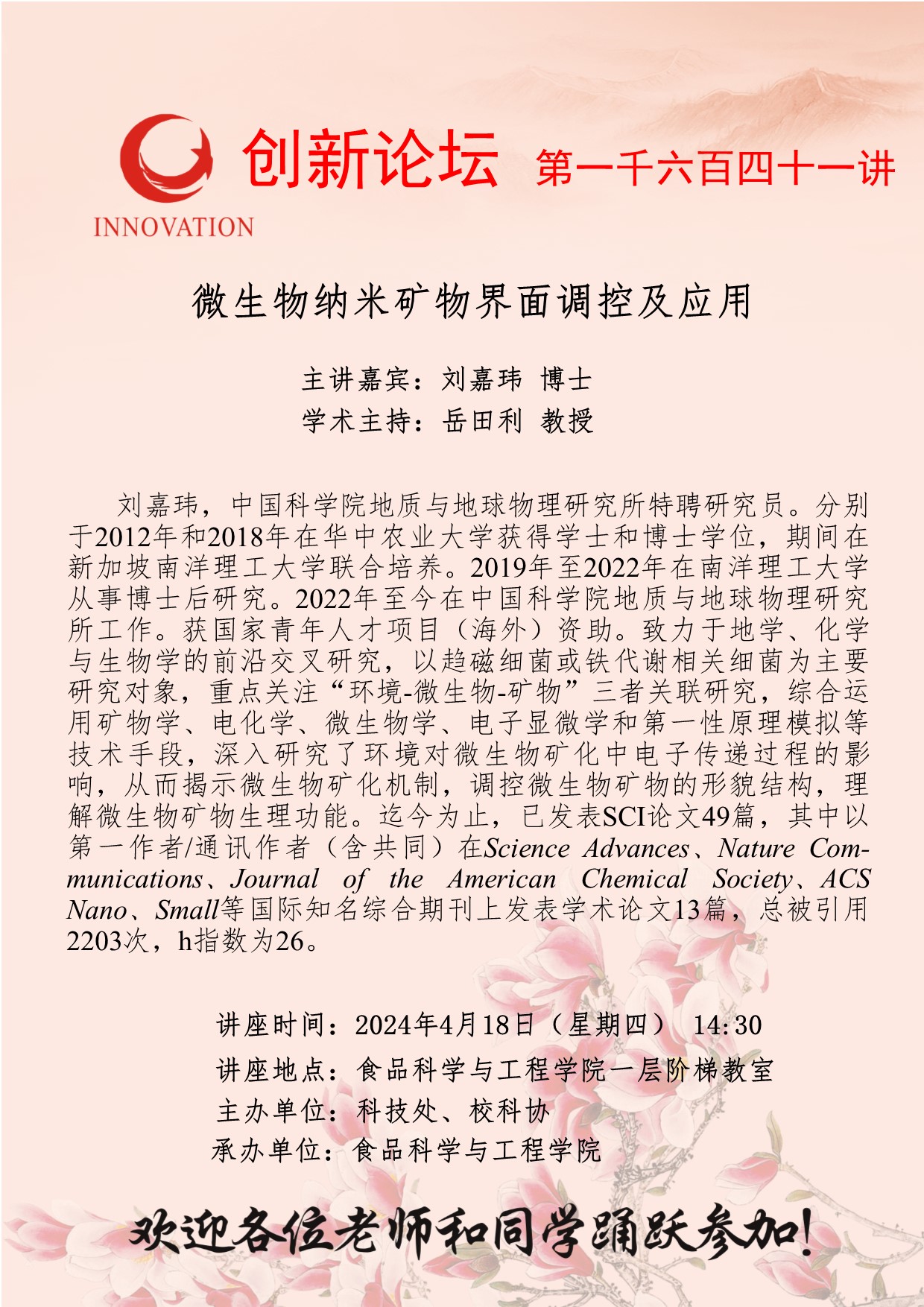 刘嘉玮 博士 欧冠官方网站创新论坛第一千六百四十一讲:微生物纳米矿物界面调控及应用 讲座时间 2024年4月18日(星期四) 14:30 讲座地点 食品科学与工程学院一层阶梯教室 讲座人介绍 刘嘉玮 博士 讲座内容