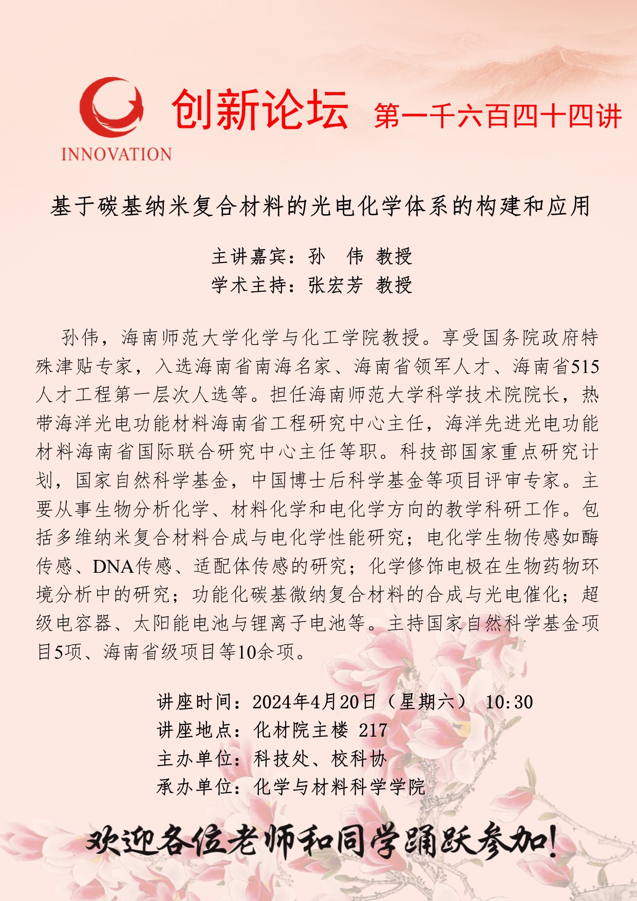 孙伟 教授 欧冠官方网站创新论坛第一千六百四十四讲:基于碳基纳米复合材料的光电化学体系的构建和应用 讲座时间 2024年4月20日(星期六) 10:30 讲座地点 化材院主楼 217 讲座人介绍 孙伟 教授 讲座内容
