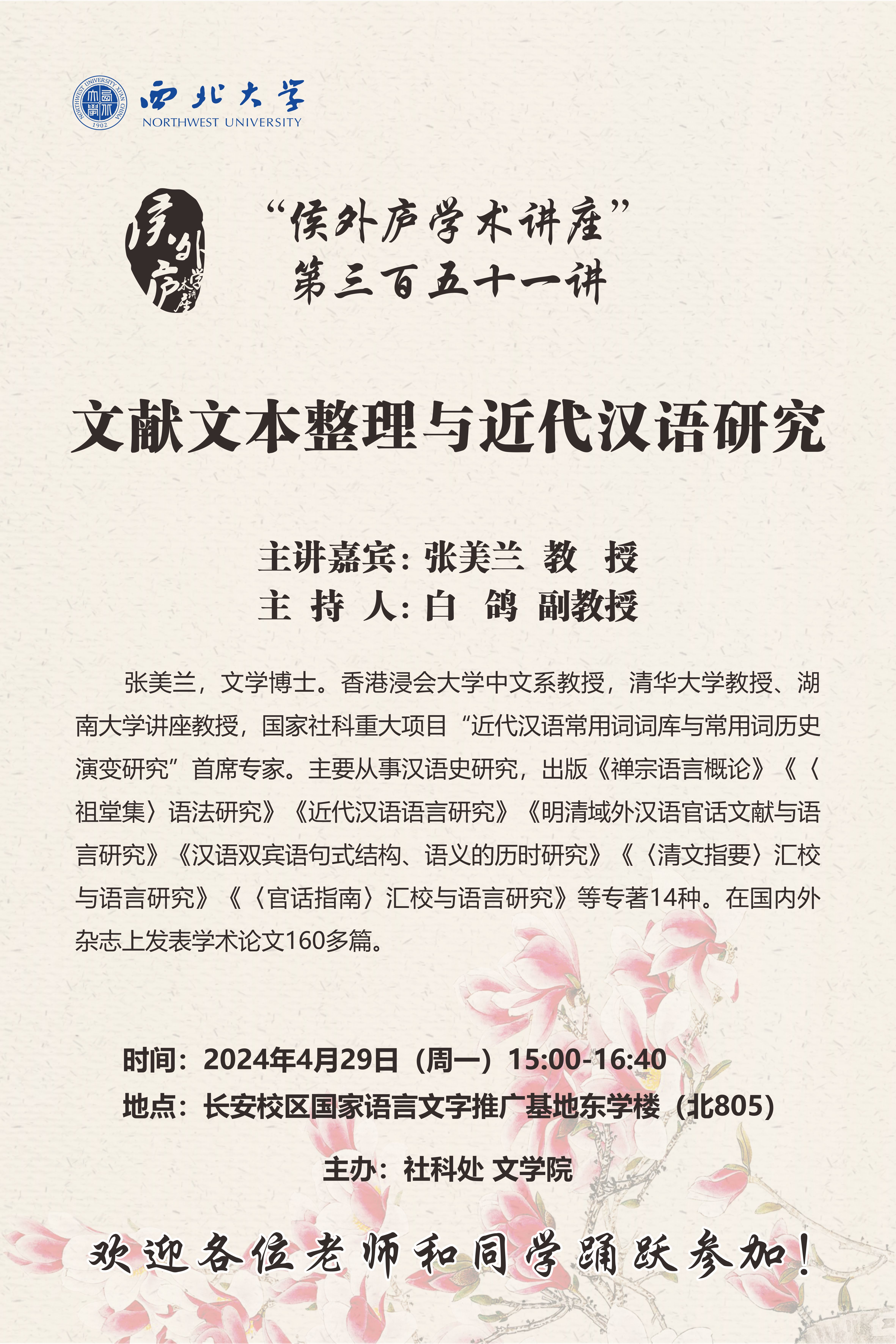 张美兰 教授 侯外庐学术讲座第三百五十一讲:文献文本整理与近代汉语研究 讲座时间 2024年4月29日(周一)15:00 讲座地点 长安校区国家语言文字推广基地 东学楼(北805) 讲座人介绍 张美兰 教授 讲座内容