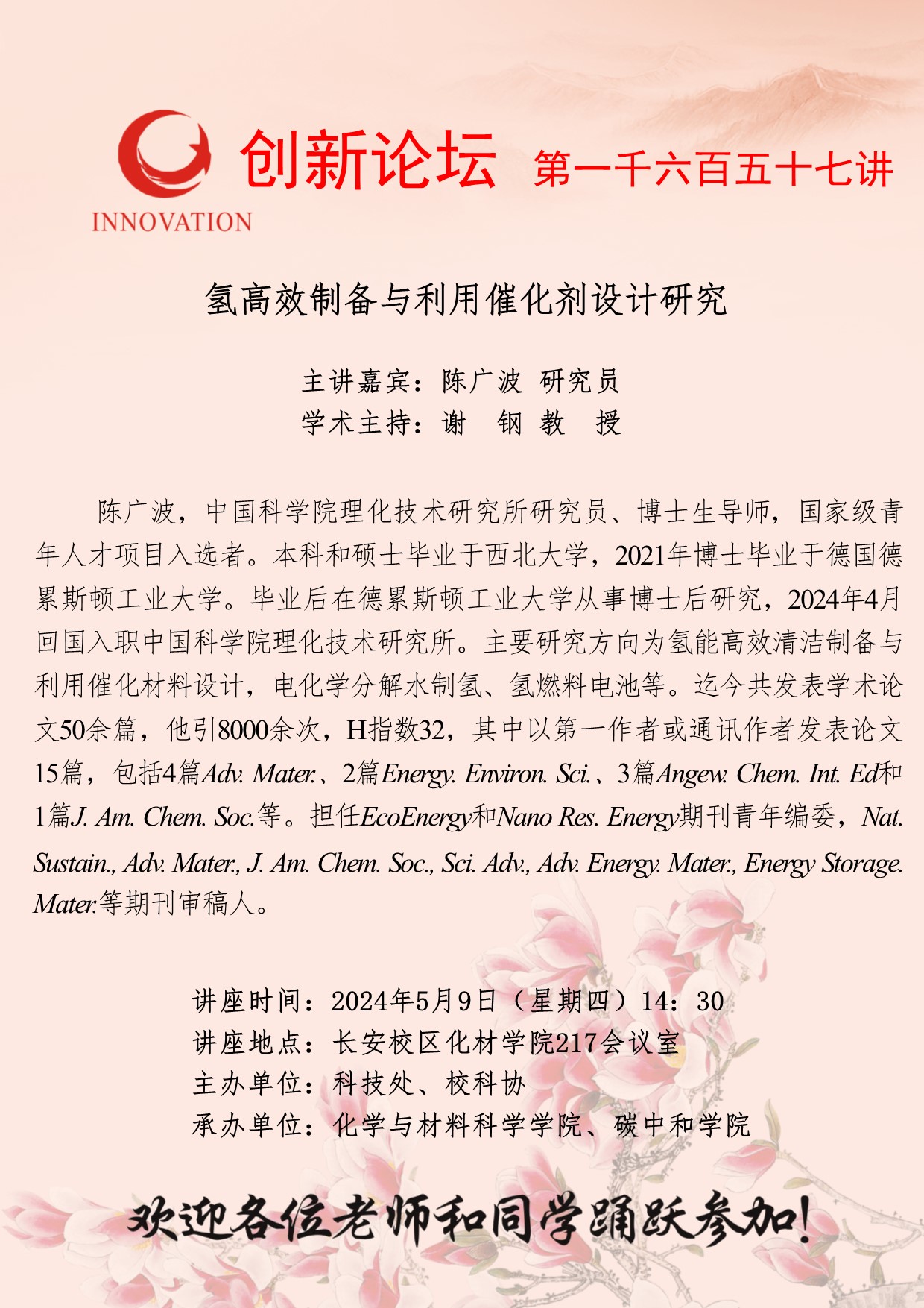 陈广波 研究员 欧冠官方网站创新论坛第一千六百五十七讲:氢高效制备与利用催化剂设计研究 讲座时间 2024年5月9日(星期四)14:30 讲座地点 长安校区化材学院217会议室 讲座人介绍 陈广波 研究员 讲座内容