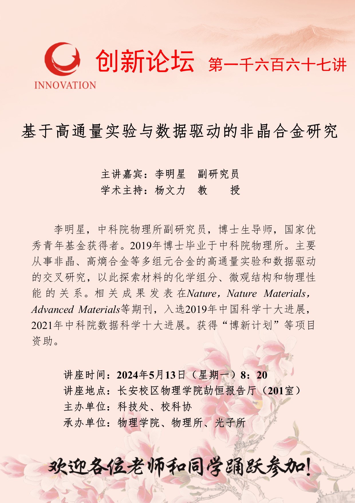 李明星 副研究员 欧冠官方网站创新论坛第一千六百六十七讲:基于高通量实验与数据驱动的非晶合金研究 讲座时间 2024年5月13日(星期一)8:20 讲座地点 长安校区物理学院劼恒报告厅(201室) 讲座人介绍 李明星 副研究员 讲座内容