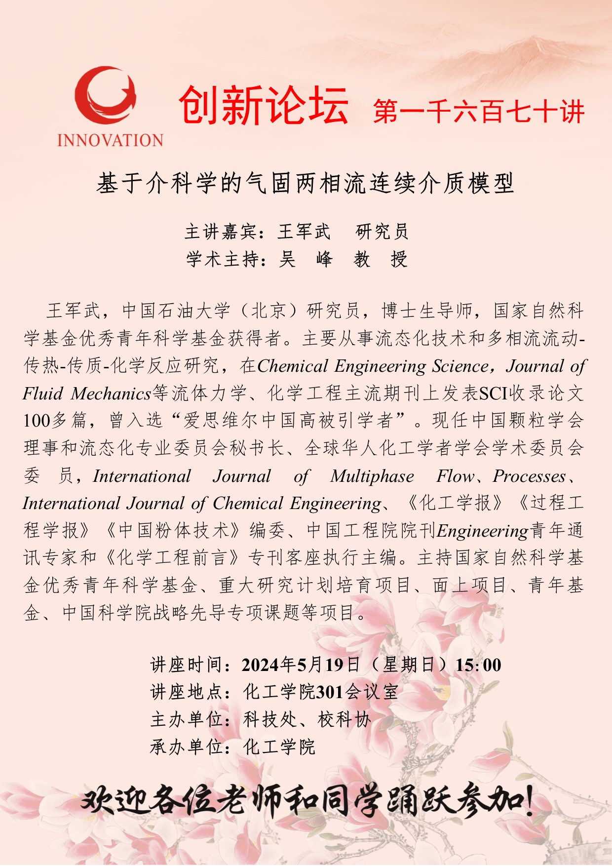 王军武 研究员 欧冠官方网站创新论坛第一千六百七十讲:基于介科学的气固两相流连续介质模型 讲座时间 2024年5月19日(星期日)15:00 讲座地点 化工学院301会议室 讲座人介绍 王军武 研究员 讲座内容