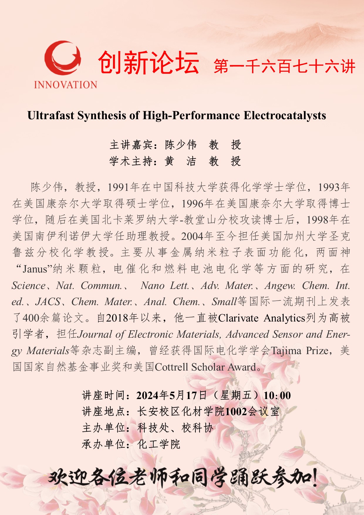 陈少伟 教授 欧冠官方网站创新论坛第一千六百七十七讲:Ultrafast Synthesis of High-Performance Electrocatalysts 讲座时间 2024年5月17日(星期五)10:00 讲座地点 长安校区化材学院1002会议室 讲座人介绍 陈少伟 教授 讲座内容