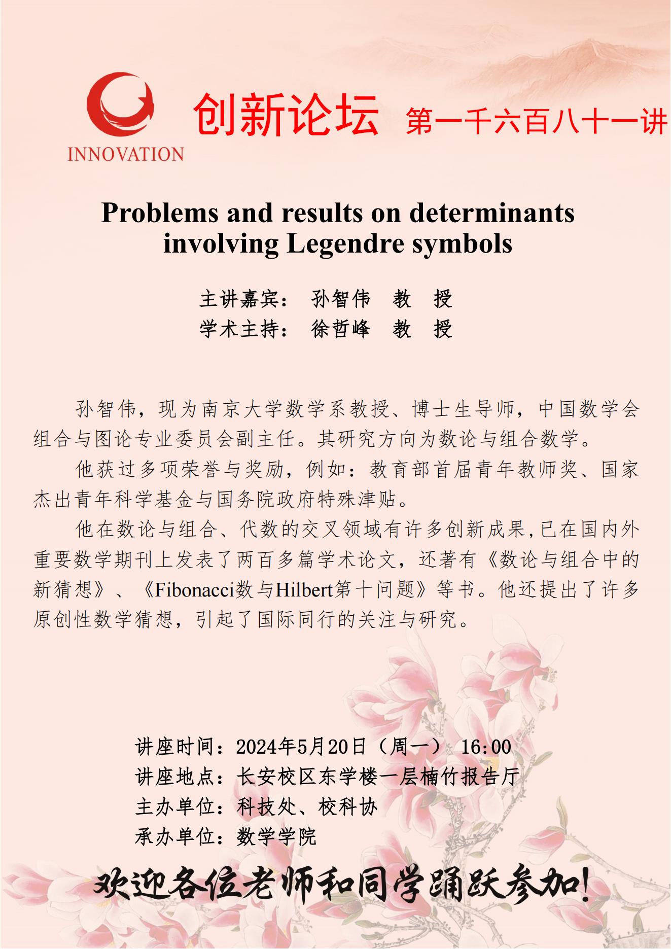 孙智伟 教授 欧冠官方网站创新论坛第一千六百八十一讲:Problems and results on determinants involving Legendre symbols 讲座时间 2024年5月20日(星期一) 16:00 讲座地点 长安校区东学楼一层楠竹报告厅 讲座人介绍 孙智伟 教授 讲座内容