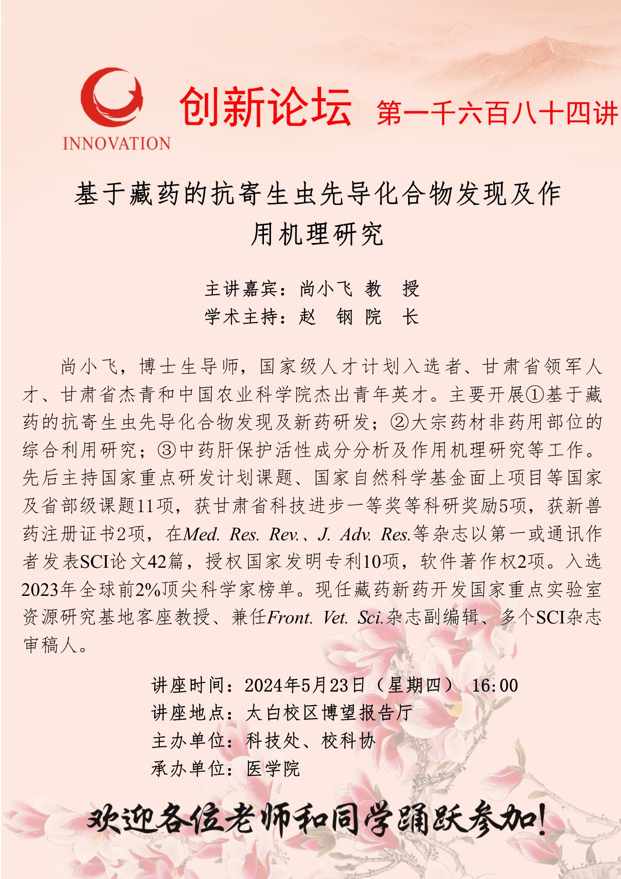 尚小飞 教授 欧冠官方网站创新论坛第一千六百八十四讲:基于藏药的抗寄生虫先导化合物发现及作用机理研究 讲座时间 2024年5月23日(星期四) 16:00 讲座地点 太白校区博望报告厅 讲座人介绍 尚小飞 教授 讲座内容