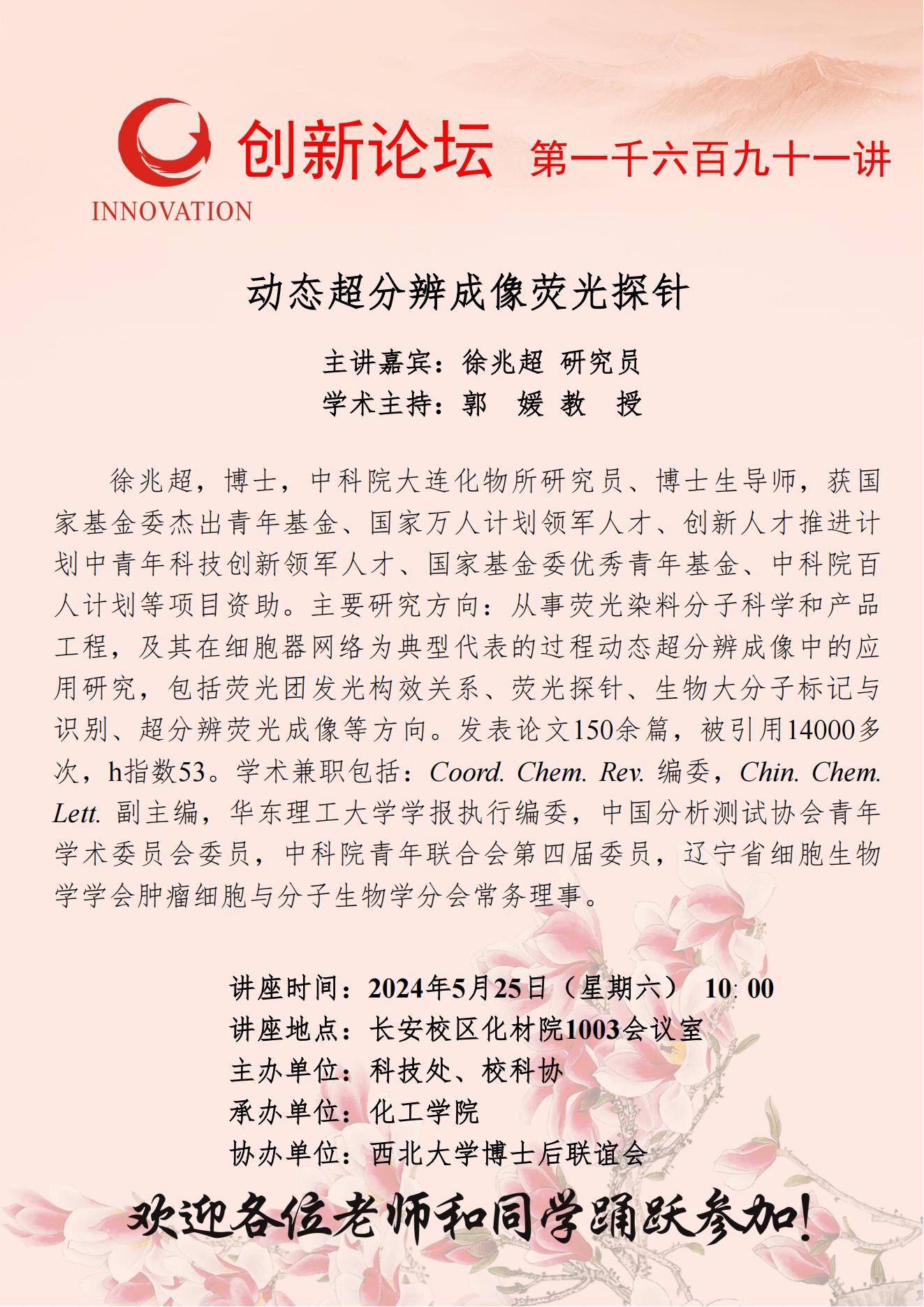 徐兆超 研究员 欧冠官方网站创新论坛第一千六百九十一讲:动态超分辨成像荧光探针 讲座时间 2024年5月25日(星期六) 10: 00 讲座地点 长安校区化材院1003会议室 讲座人介绍 徐兆超 研究员 讲座内容