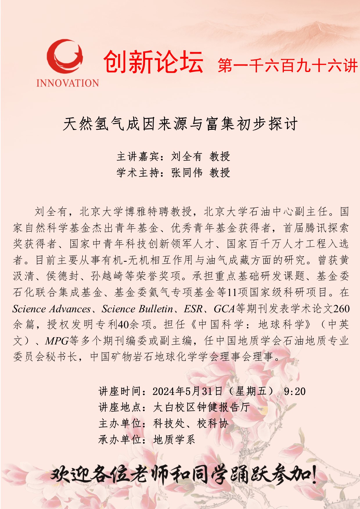 刘全有 教授 欧冠官方网站创新论坛第一千六百九十六讲:天然氢气成因来源与富集初步探讨 讲座时间 2024年5月31日(星期五) 9:20 讲座地点 太白校区钟健报告厅 讲座人介绍 刘全有 教授 讲座内容