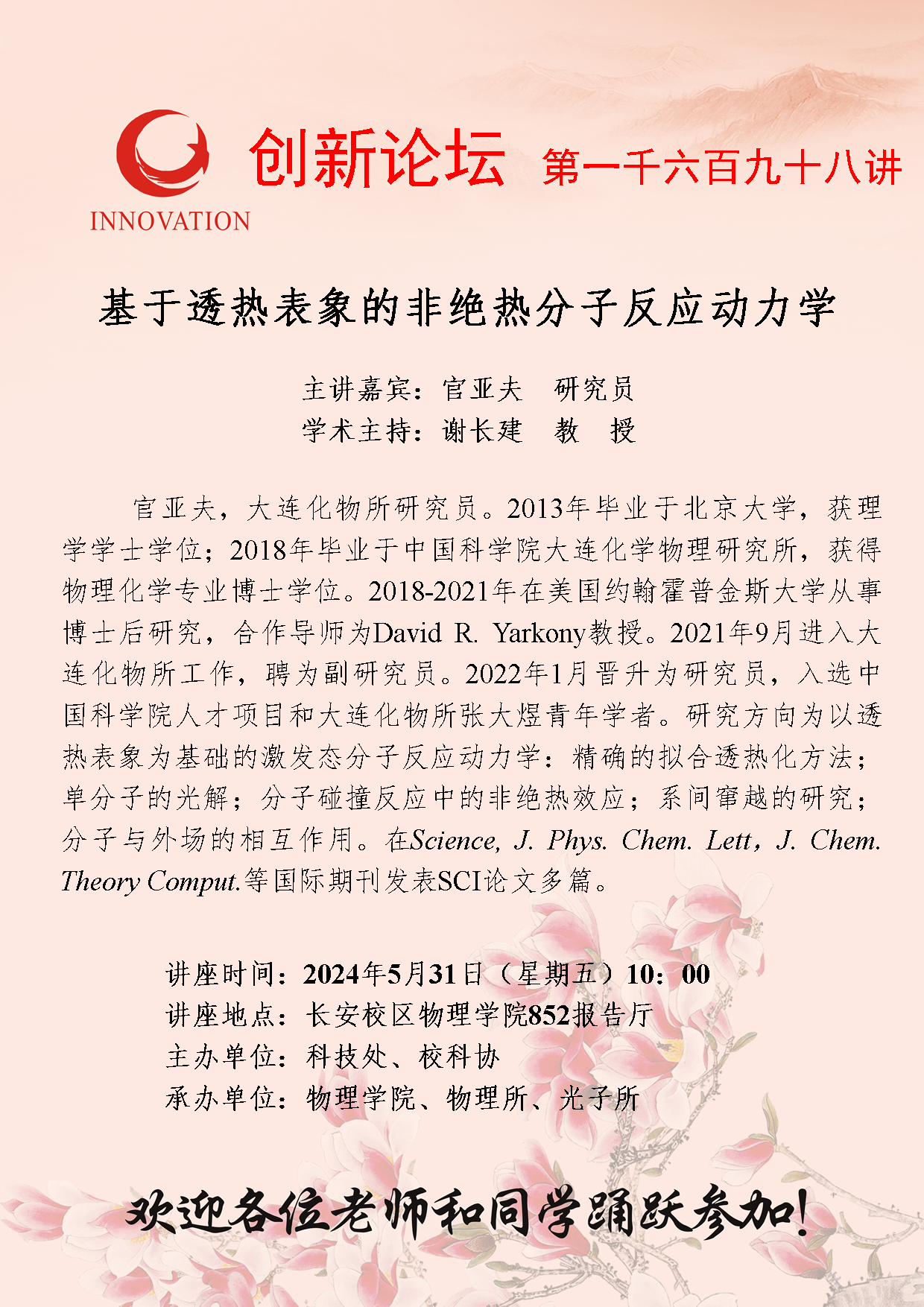 官亚夫 研究员 欧冠官方网站创新论坛第一千六百九十八讲:基于透热表象的非绝热分子反应动力学 讲座时间 2024年5月31日(星期五)10:00 讲座地点 长安校区物理学院852报告厅 讲座人介绍 官亚夫 研究员 讲座内容