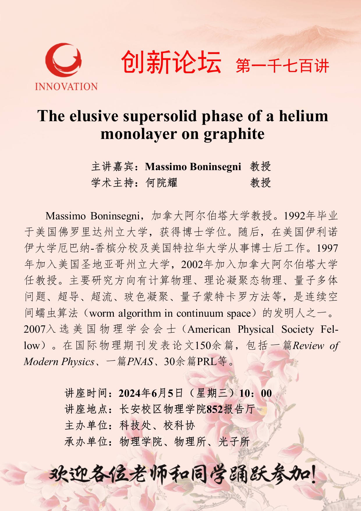 Massimo Boninsegni 教授 欧冠官方网站创新论坛第一千七百讲:The elusive supersolid phase of a helium monolayer on graphite 讲座时间 2024年6月5日(星期三)10:00 讲座地点 长安校区物理学院852报告厅 讲座人介绍 Massimo Boninsegni 教授 讲座内容