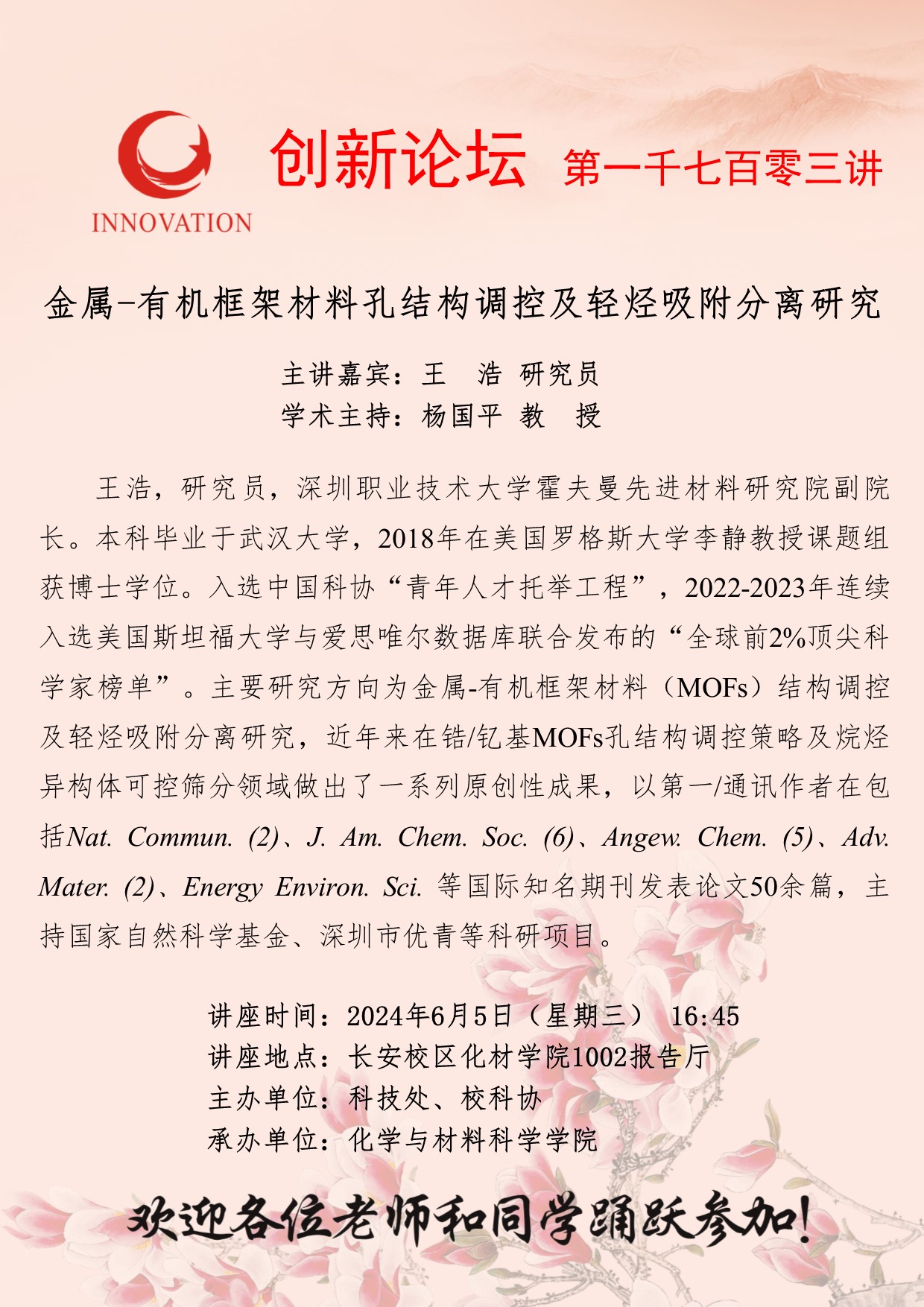 王浩 研究员 欧冠官方网站创新论坛第一千七百零三讲:金属-有机框架材料孔结构调控及轻烃吸附分离研究 讲座时间 2024年6月5日(星期三) 16:45 讲座地点 长安校区化材学院1002报告厅 讲座人介绍 王浩 研究员 讲座内容
