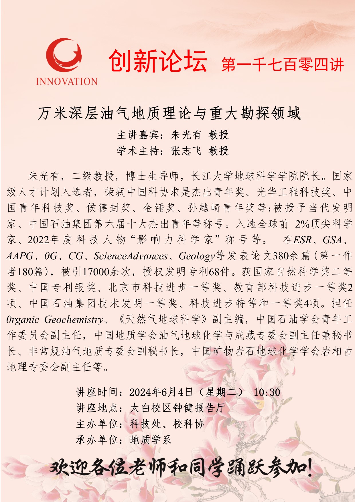朱光有 教授 欧冠官方网站创新论坛第一千七百零四讲:万米深层油气地质理论与重大勘探领域 讲座时间 2024年6月4日(星期二) 10:30 讲座地点 太白校区钟健报告厅 讲座人介绍 朱光有 教授 讲座内容