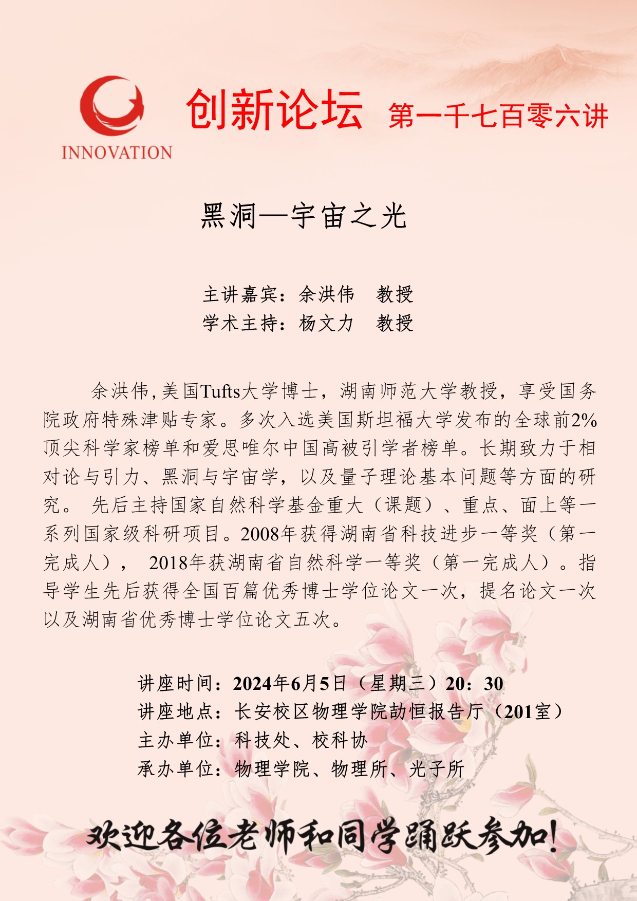 余洪伟 教授 欧冠官方网站创新论坛第一千七百零六讲:黑洞—宇宙之光 讲座时间 2024年6月5日(星期三)20:30 讲座地点 长安校区物理学院劼恒报告厅(201室) 讲座人介绍 余洪伟 教授 讲座内容