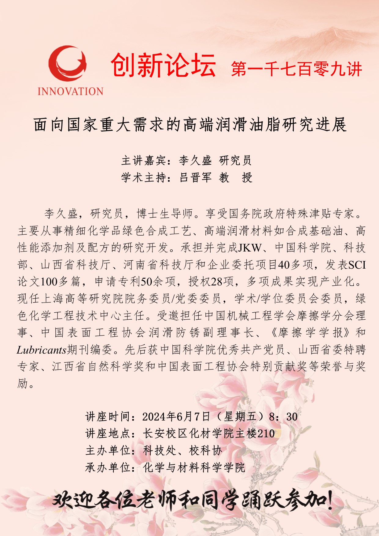 李久盛 研究员 欧冠官方网站创新论坛第一千七百零九讲:面向国家重大需求的高端润滑油脂研究进展 讲座时间 2024年6月7日(星期五)8:30 讲座地点 长安校区化材学院主楼210 讲座人介绍 李久盛 研究员 讲座内容