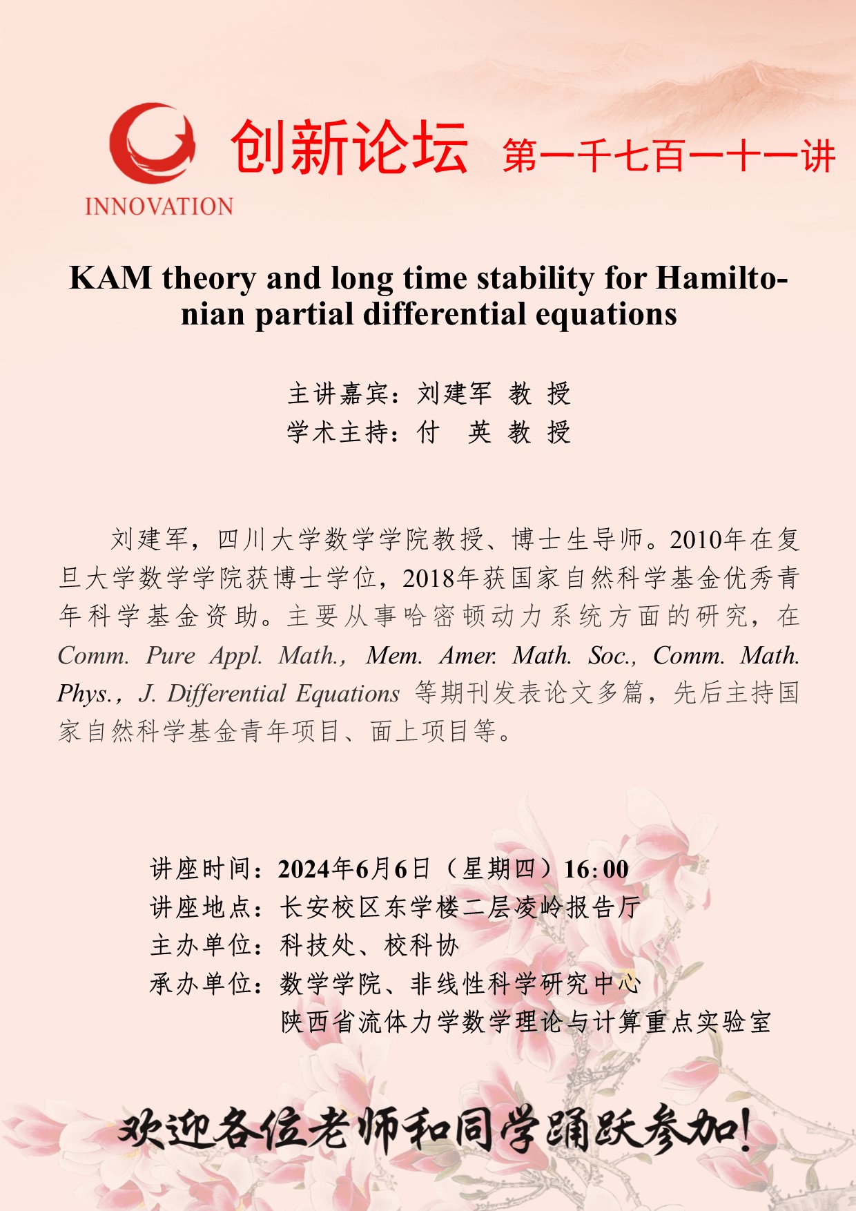 刘建军 教授 欧冠官方网站创新论坛第一千七百一十一讲:KAM theory and long time stability for Hamiltonian partial differential equations 讲座时间 2024年6月6日(星期四)16:00 讲座地点 长安校区东学楼二层凌岭报告厅 讲座人介绍 刘建军 教授 讲座内容