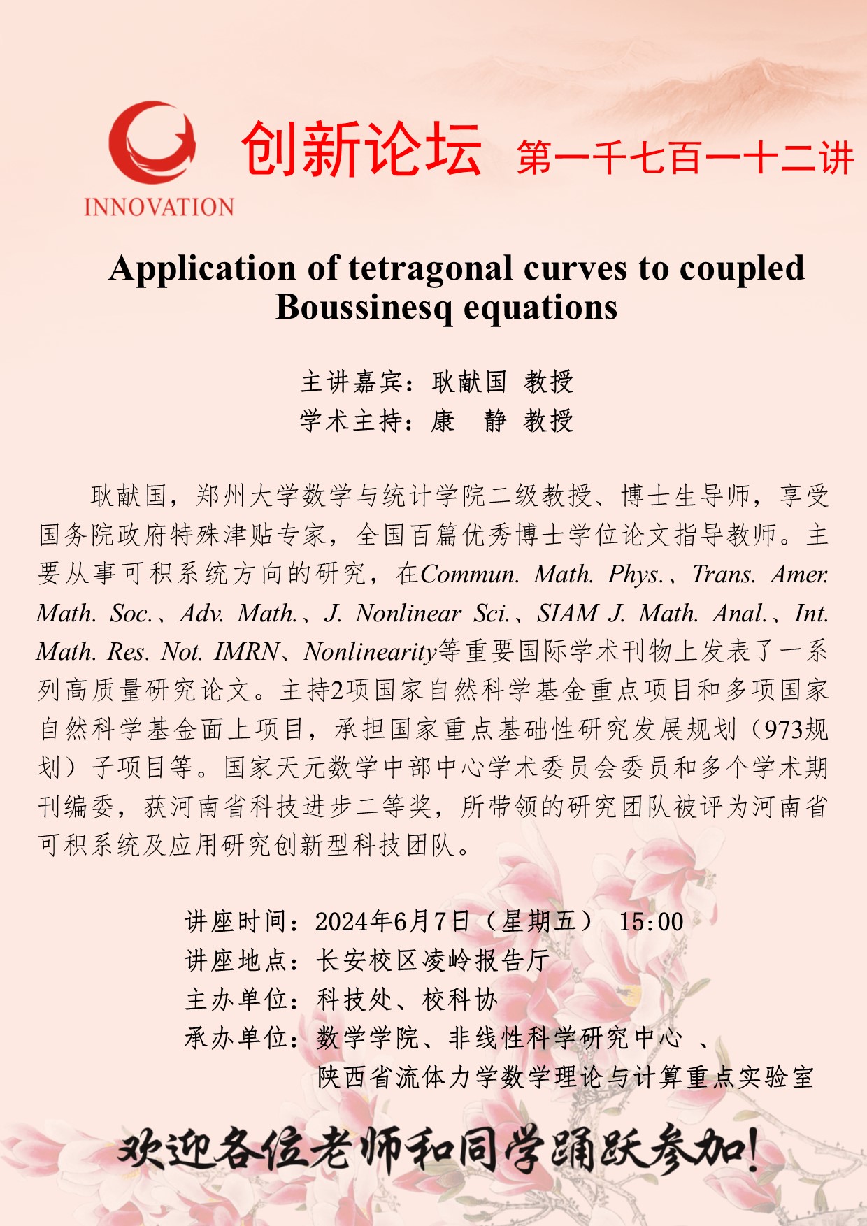 耿献国 教授 欧冠官方网站创新论坛第一千七百一十二讲:Application of tetragonal curves to coupled Boussinesq equations 讲座时间 2024年6月7日(星期五) 15:00 讲座地点 长安校区凌岭报告厅 讲座人介绍 耿献国 教授 讲座内容