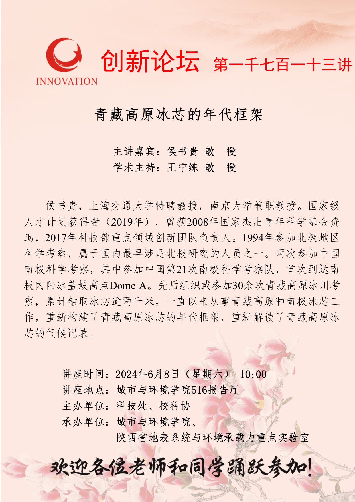 侯书贵 教授 欧冠官方网站创新论坛第一千七百一十三讲:青藏高原冰芯的年代框架 讲座时间 2024年6月8日(星期六) 10:00 讲座地点 城市与环境学院516报告厅 讲座人介绍 侯书贵 教授 讲座内容