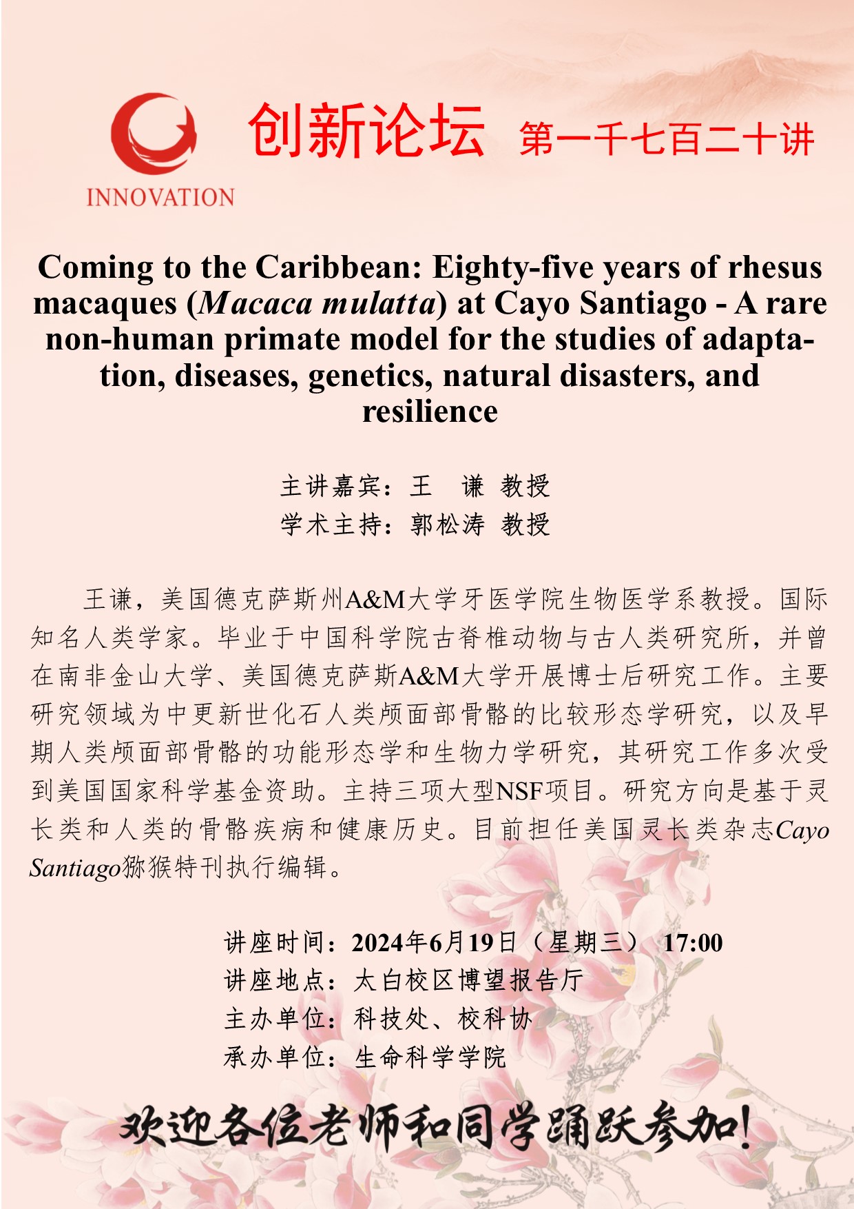 王谦 教授 欧冠官方网站创新论坛第一千七百二十讲:Coming to the Caribbean: Eighty-five years of rhesus macaques (Macaca mulatta) at Cayo Santiago - A rare non-human primate model for the studies of adaptation, diseases, genetics, natural disasters, and resilience 讲座时间 2024年6月19日(星期三) 17:00 讲座地点 太白校区博望报告厅 讲座人介绍 王谦 教授 讲座内容