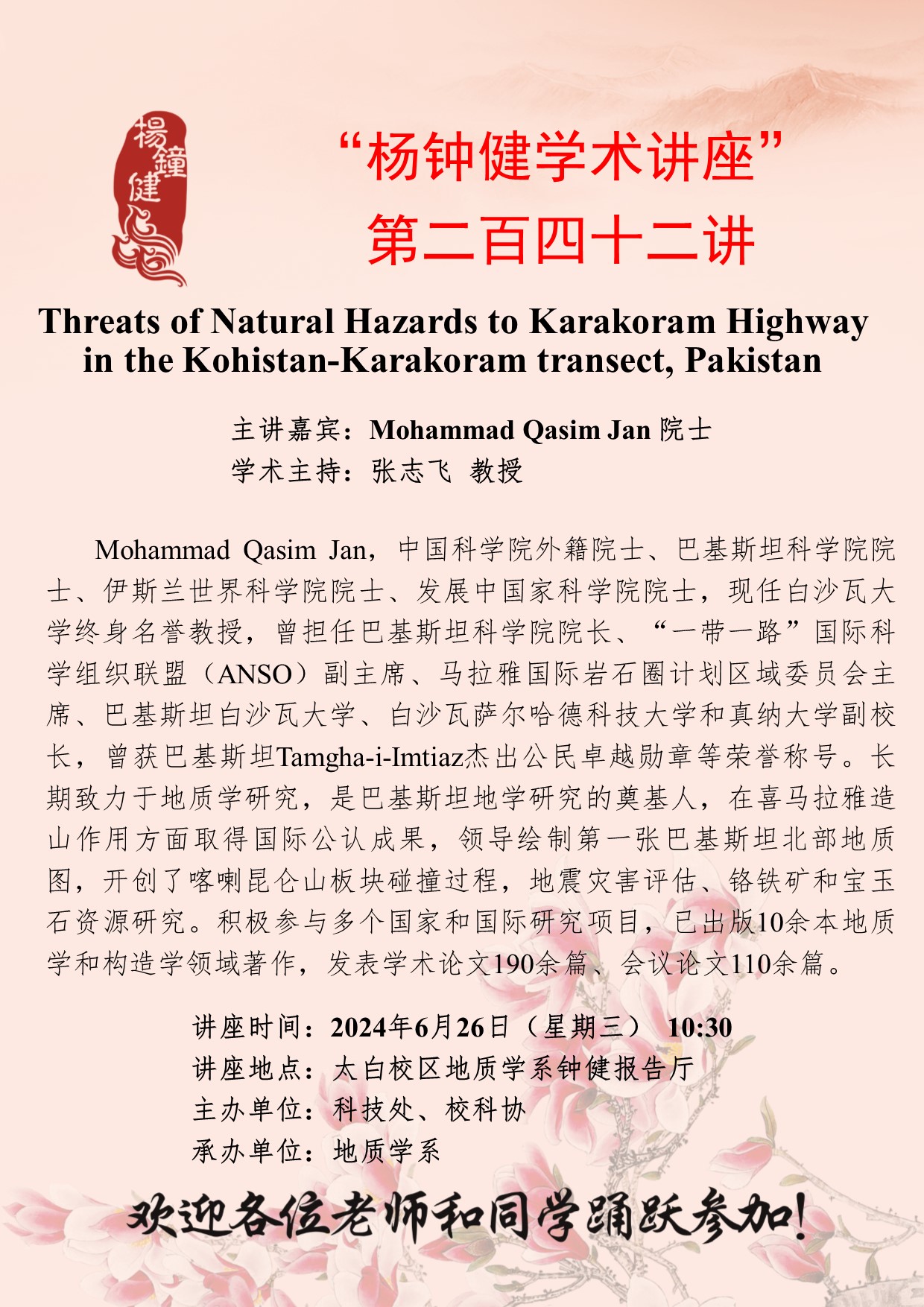 Mohammad Qasim Jan 院士 “杨钟健学术讲座”第二百四十二讲:Threats of Natural Hazards to Karakoram Highway in the Kohistan-Karakoram transect, Pakistan 讲座时间 2024年6月26日(星期三) 10:30 讲座地点 太白校区地质学系钟健报告厅 讲座人介绍 Mohammad Qasim Jan 院士 讲座内容
