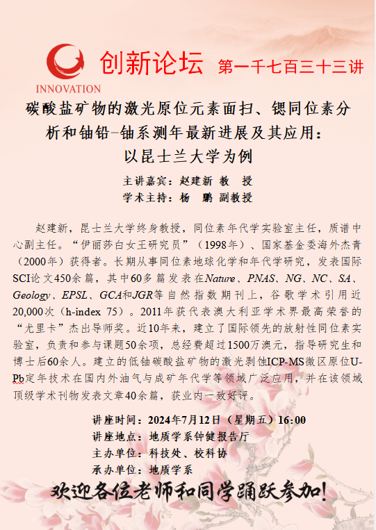 赵建新 教授 欧冠官方网站创新论坛第一千七百三十三讲:碳酸盐矿物的激光原位元素面扫、锶同位素分析和铀铅-铀系测年最新进展及其应用:以昆士兰大学为例 讲座时间 2024年7月12日(星期五)16:00 讲座地点 地质学系钟健报告厅 讲座人介绍 赵建新 教授 讲座内容