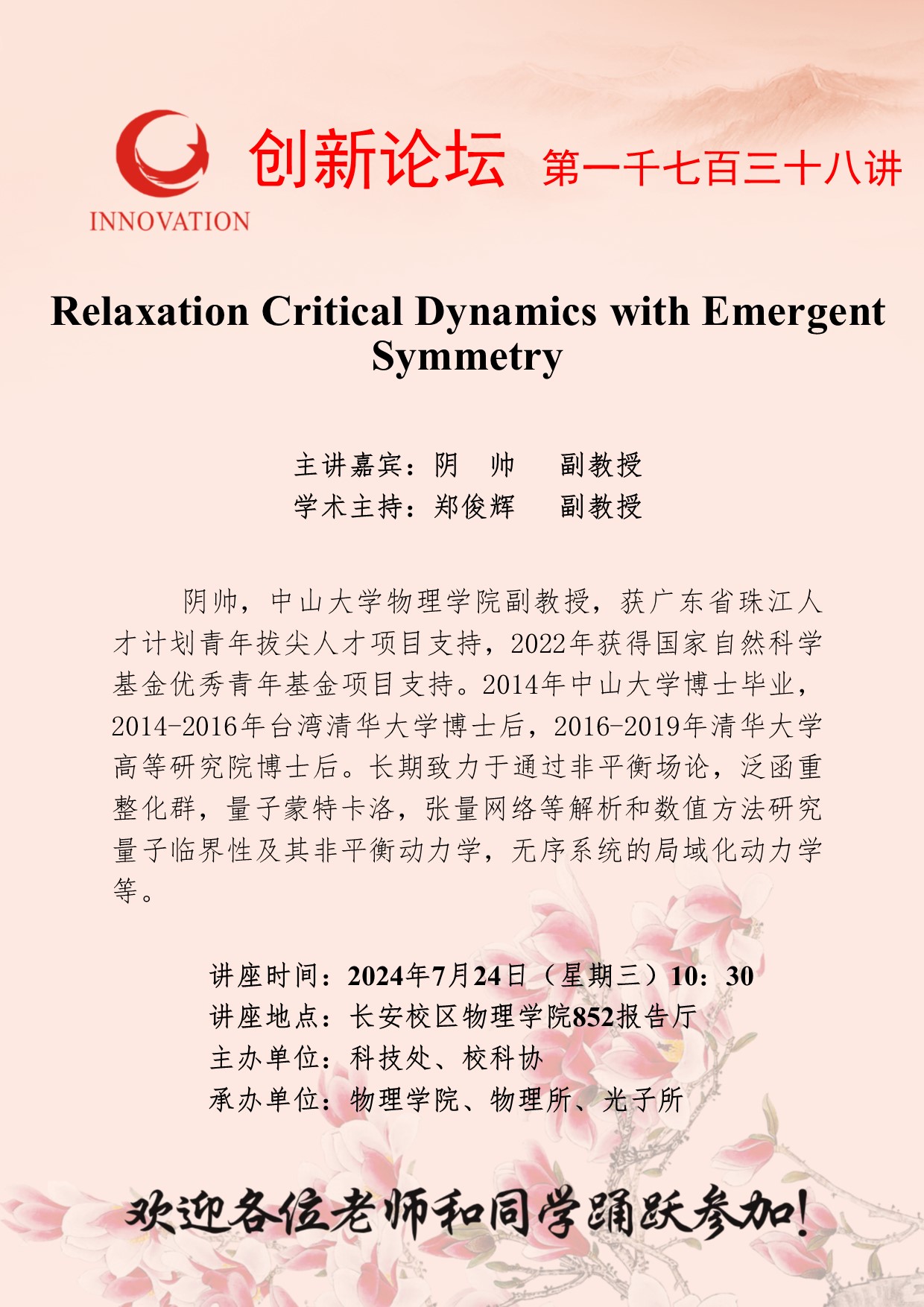 阴帅 副教授 欧冠官方网站创新论坛第一千七百三十八讲:Relaxation Critical Dynamics with Emergent Symmetry 讲座时间 2024年7月24日(星期三)10:30 讲座地点 长安校区物理学院852报告厅 讲座人介绍 阴帅 副教授 讲座内容