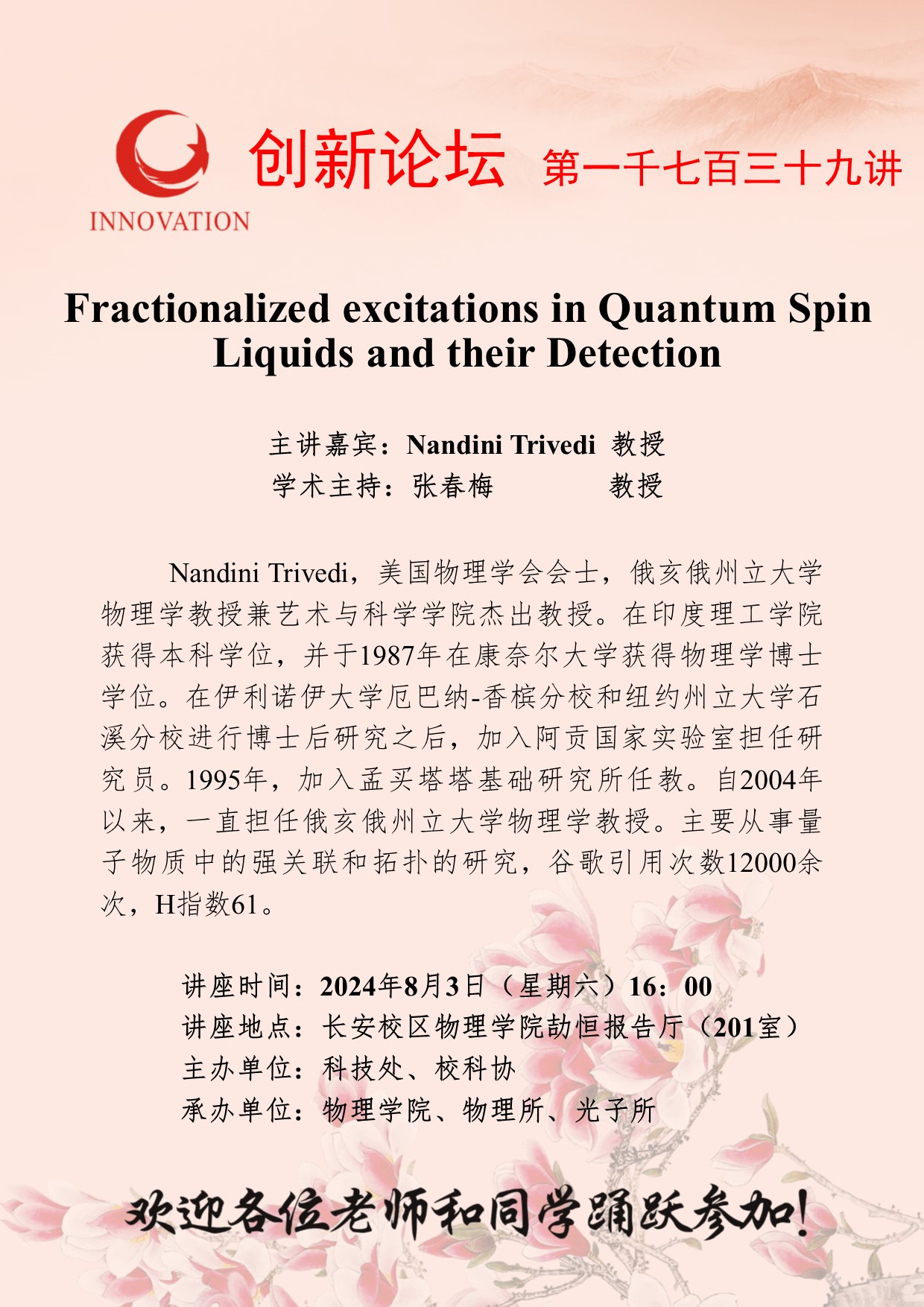 Nandini Trivedi 教授 欧冠官方网站创新论坛第一千七百三十九讲:Fractionalized excitations in Quantum Spin Liquids and their Detection 讲座时间 2024年8月3日(星期六)16:00 讲座地点 长安校区物理学院劼恒报告厅(201室) 讲座人介绍 Nandini Trivedi 教授 讲座内容
