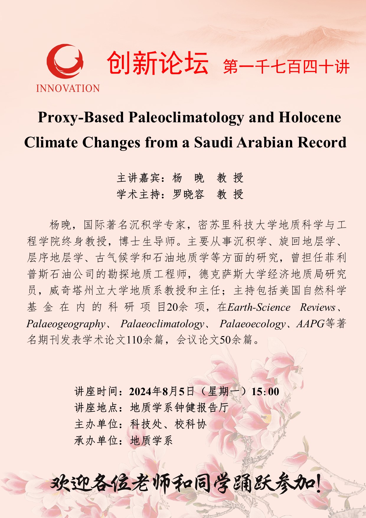 杨晚 教授 欧冠官方网站创新论坛第一千七百四十讲: Proxy-Based Paleoclimatology and Holocene Climate Changes from a Saudi Arabian Record 讲座时间 2024年8月5日(星期一)15:00 讲座地点 地质学系钟健报告厅 讲座人介绍 杨晚 教授 讲座内容