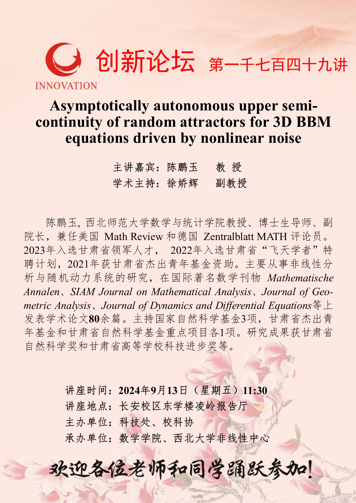 陈鹏玉 教授 欧冠官方网站创新论坛第一千七百四十九讲:Asymptotically autonomous upper semi-continuity of random attractors for 3D BBM equations driven by nonlinear noise 讲座时间 2024年9月13日(星期五)11:30 讲座地点 长安校区东学楼凌岭报告厅 讲座人介绍 陈鹏玉 教授 讲座内容