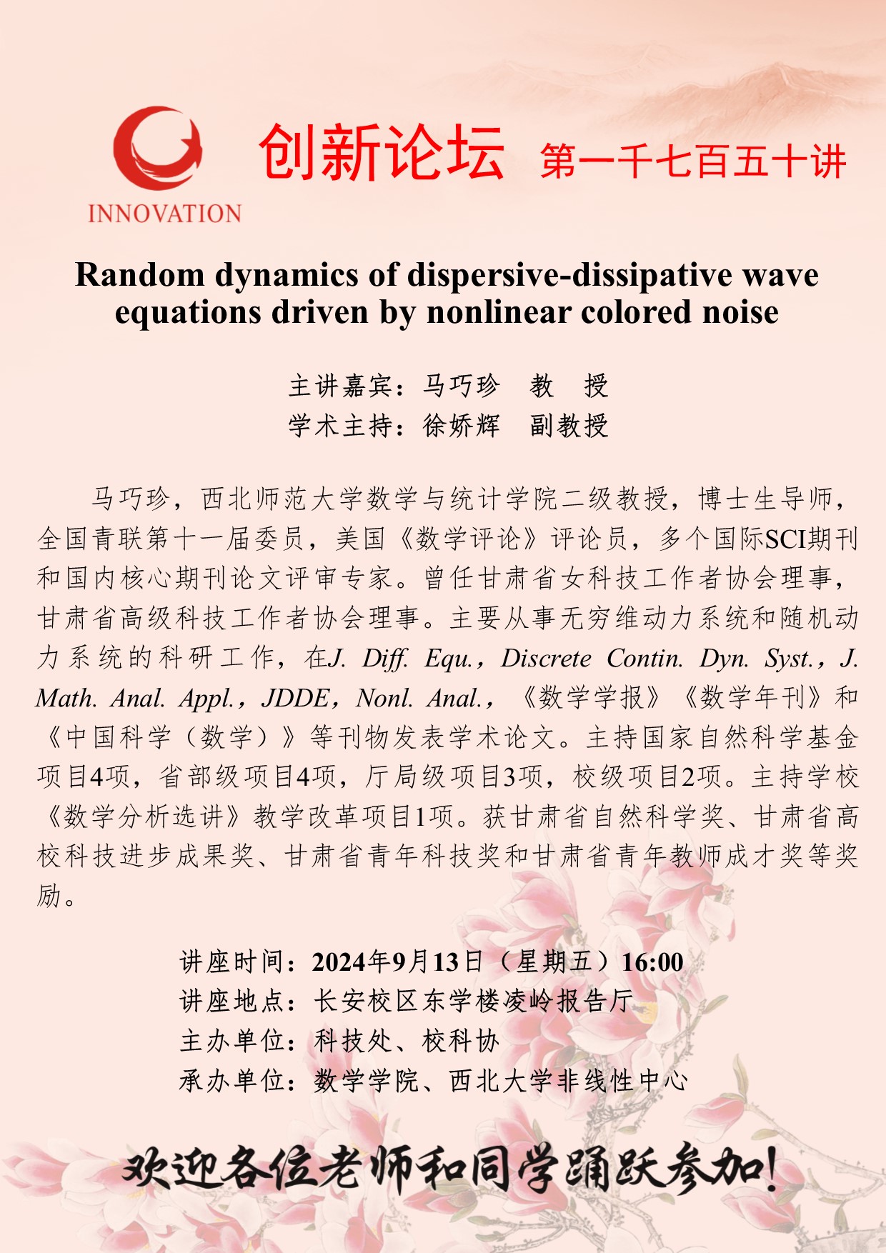 马巧珍 教授 欧冠官方网站创新论坛第一千七百五十讲:Random dynamics of dispersive-dissipative wave equations driven by nonlinear colored noise 讲座时间 2024年9月13日(星期五)16:00 讲座地点 长安校区东学楼凌岭报告厅 讲座人介绍 马巧珍 教授 讲座内容