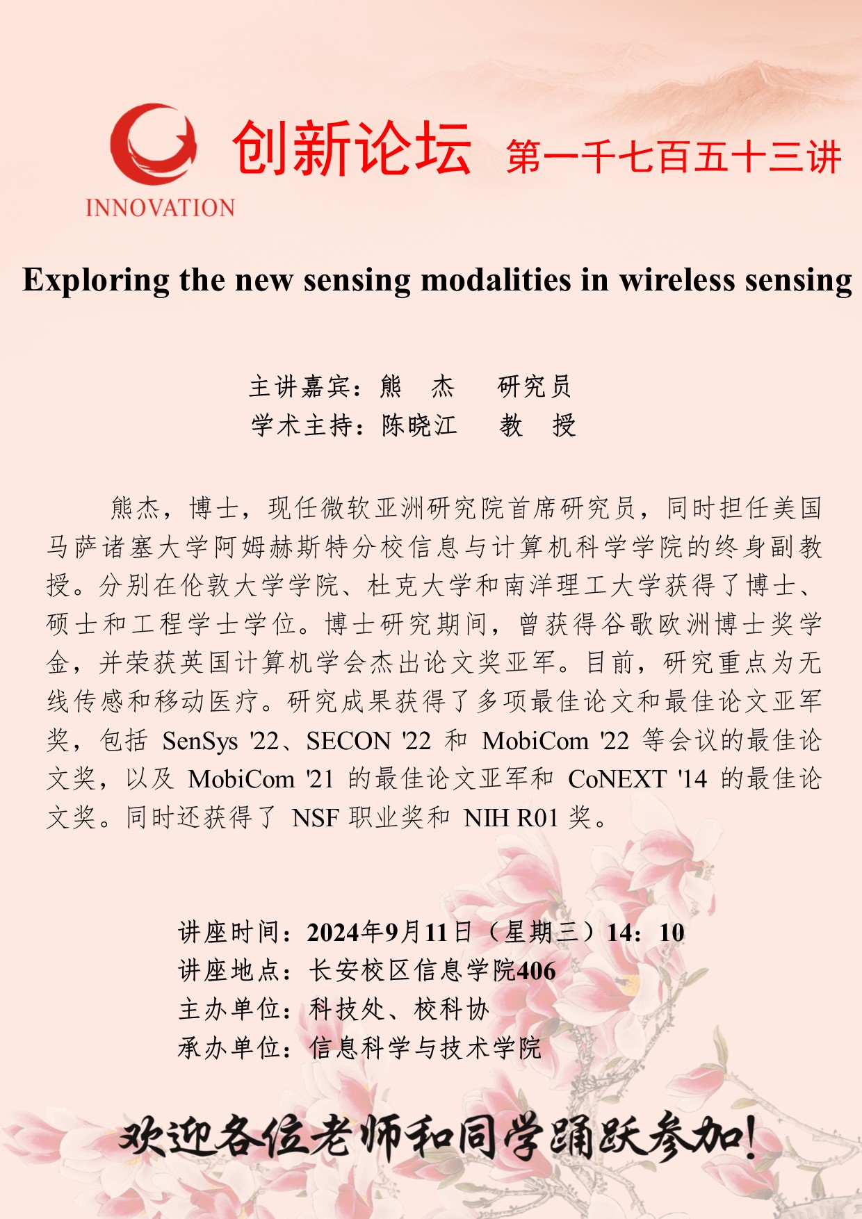 熊杰 研究员 欧冠官方网站创新论坛第一千七百五十三讲:Exploring the new sensing modalities in wireless sensing 讲座时间 2024年9月11日(星期三)14:10 讲座地点 长安校区信息学院406 讲座人介绍 熊杰 研究员 讲座内容