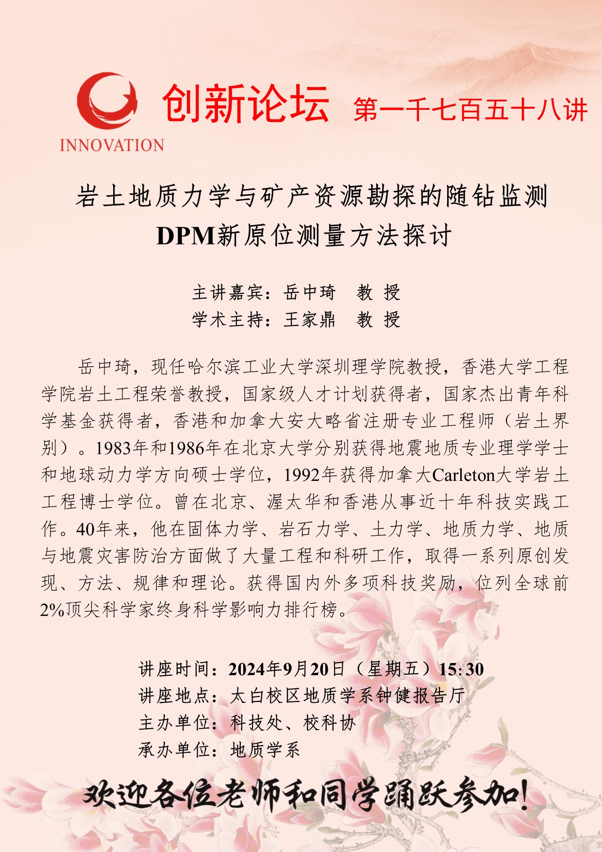 岳中琦 教授 欧冠官方网站创新论坛第一千七百五十八讲:岩土地质力学与矿产资源勘探的随钻监测 DPM新原位测量方法探讨 讲座时间 2024年9月20日(星期五) 15:30 讲座地点 太白校区地质学系钟健报告厅 讲座人介绍 岳中琦 教授 讲座内容