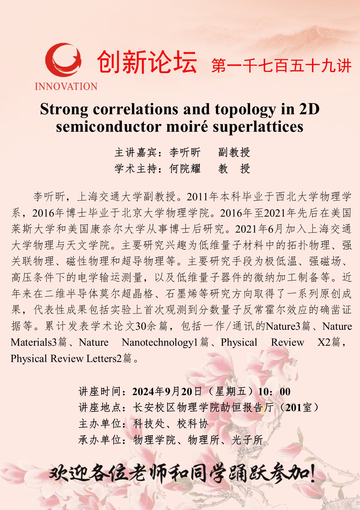 李听昕 副教授 欧冠官方网站创新论坛第一千七百五十九讲:Strong correlations and topology in 2D semiconductor moiré superlattices 讲座时间 2024年9月20日(星期五) 10:00 讲座地点 长安校区物理学院劼恒报告厅(201室) 讲座人介绍 李听昕 副教授 讲座内容