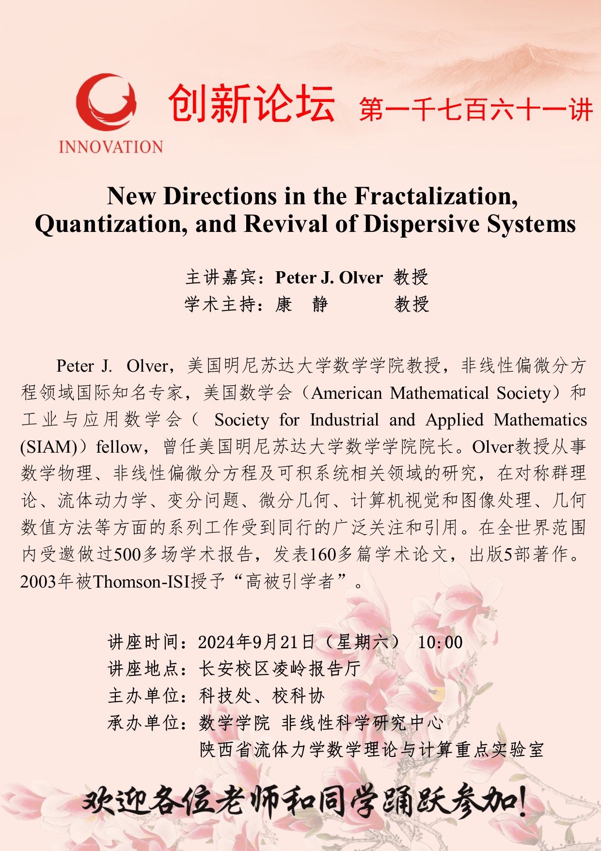Peter J. Olver 教授 欧冠官方网站创新论坛第一千七百六十一讲:New Directions in the Fractalization,Quantization, and Revival of Dispersive Systems 讲座时间 2024年9月21日(星期六) 10:00 讲座地点 长安校区凌岭报告厅 讲座人介绍 Peter J. Olver 教授 讲座内容