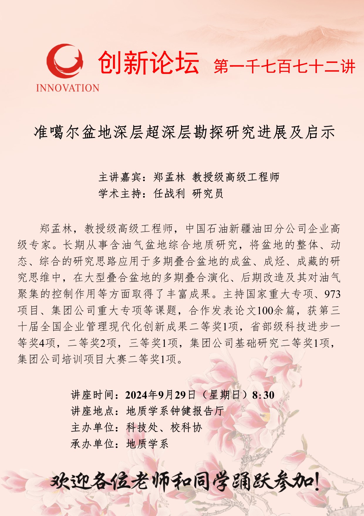 郑孟林 教授级高级工程师 欧冠官方网站创新论坛第一千七百七十二讲:准噶尔盆地深层超深层勘探研究进展及启示 讲座时间 2024年9月29日(星期日)8:30 讲座地点 地质学系钟健报告厅 讲座人介绍 郑孟林 教授级高级工程师 讲座内容