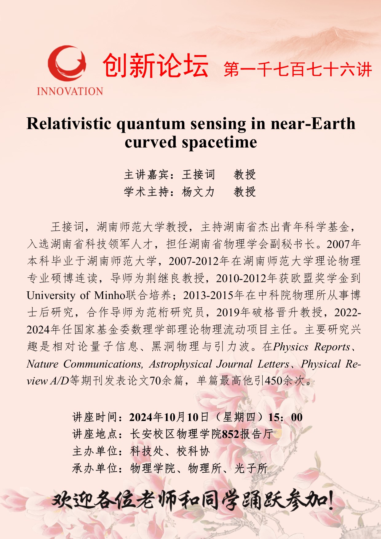 王接词 教授 欧冠官方网站创新论坛第一千七百七十六讲:Relativistic quantum sensing in near-Earth curved spacetime 讲座时间 2024年10月10日(星期四)15:00 讲座地点 长安校区物理学院852报告厅 讲座人介绍 王接词 教授 讲座内容