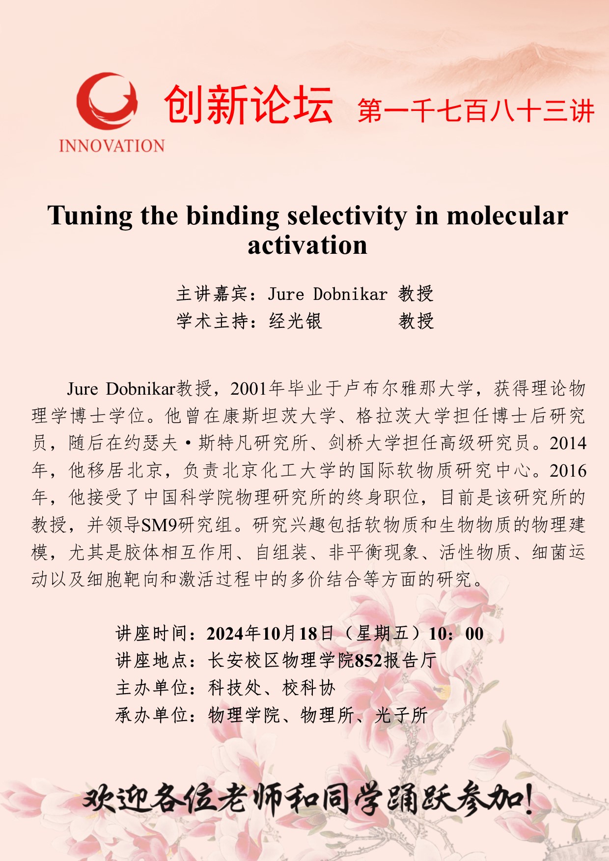 Jure Dobnikar 教授 欧冠官方网站创新论坛第一千七百八十三讲:Tuning the binding selectivity in molecular activation 讲座时间 2024年10月18日(星期五)10:00 讲座地点 长安校区物理学院852报告厅 讲座人介绍 Jure Dobnikar 教授 讲座内容