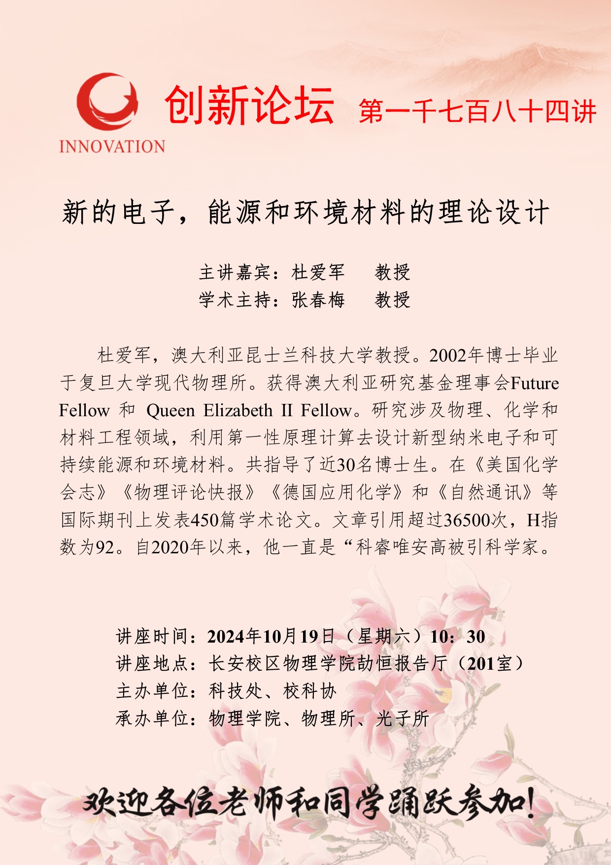 杜爱军 教授 欧冠官方网站创新论坛第一千七百八十四讲:新的电子,能源和环境材料的理论设计 讲座时间 2024年10月19日(星期六)10:30 讲座地点 长安校区物理学院劼恒报告厅(201室) 讲座人介绍 杜爱军 教授 讲座内容