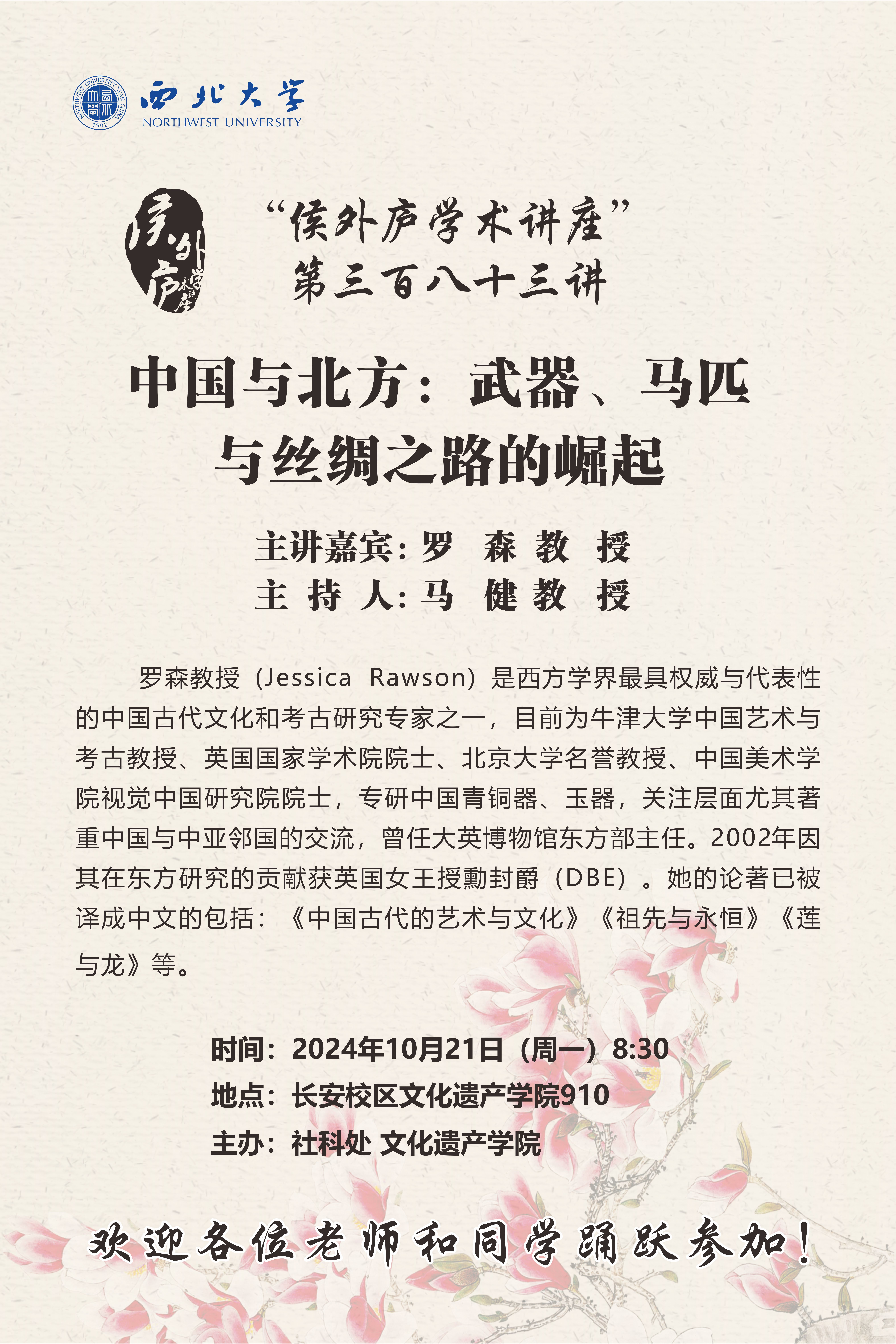 罗森 教授 “侯外庐学术讲座”第三百八十三讲:中国与北方:武器、马匹与丝绸之路的崛起 讲座时间 2024年10月21日(周一)8:30 讲座地点 长安校区文化遗产学院910室 讲座人介绍 罗森 教授 讲座内容