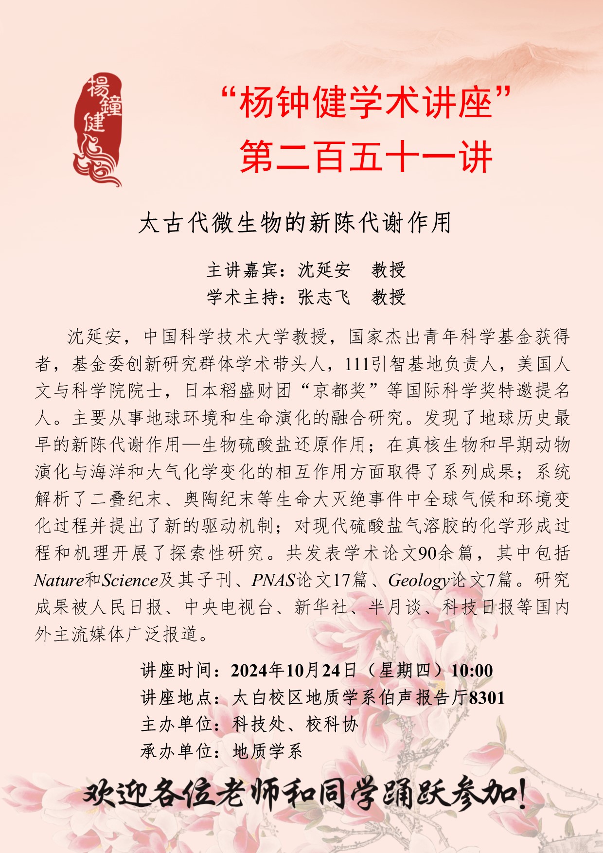 沈延安 院士 “杨钟健学术讲座”第二百五十一讲:太古代微生物的新陈代谢作用 讲座时间 2024年10月24日(星期四)10:00 讲座地点 太白校区地质学系伯声报告厅8301 讲座人介绍 沈延安 院士 讲座内容