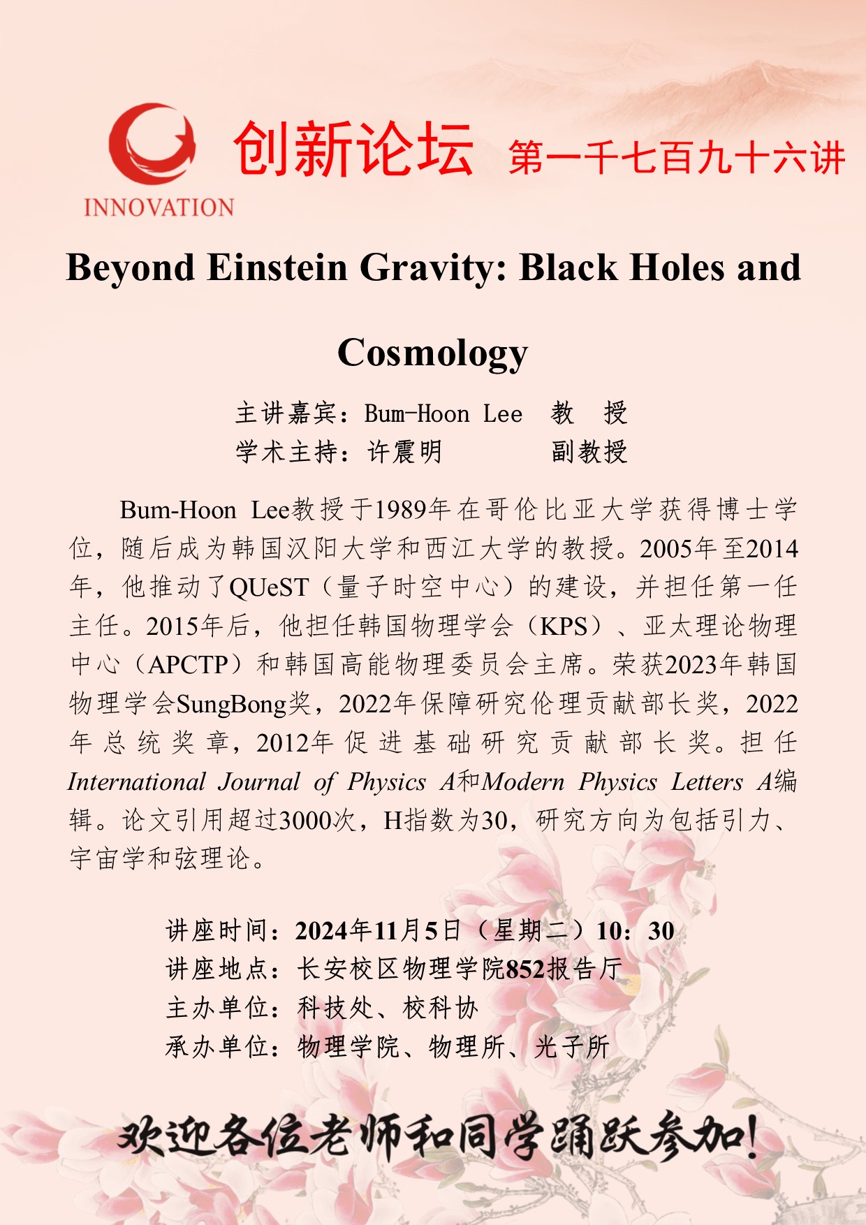 Bum-Hoon Lee 教授 欧冠官方网站创新论坛第一千七百九十六讲:Beyond Einstein Gravity: Black Holes and Cosmology 讲座时间 2024年11月5日(星期二)10:30 讲座地点 长安校区物理学院852报告厅 讲座人介绍 Bum-Hoon Lee 教授 讲座内容